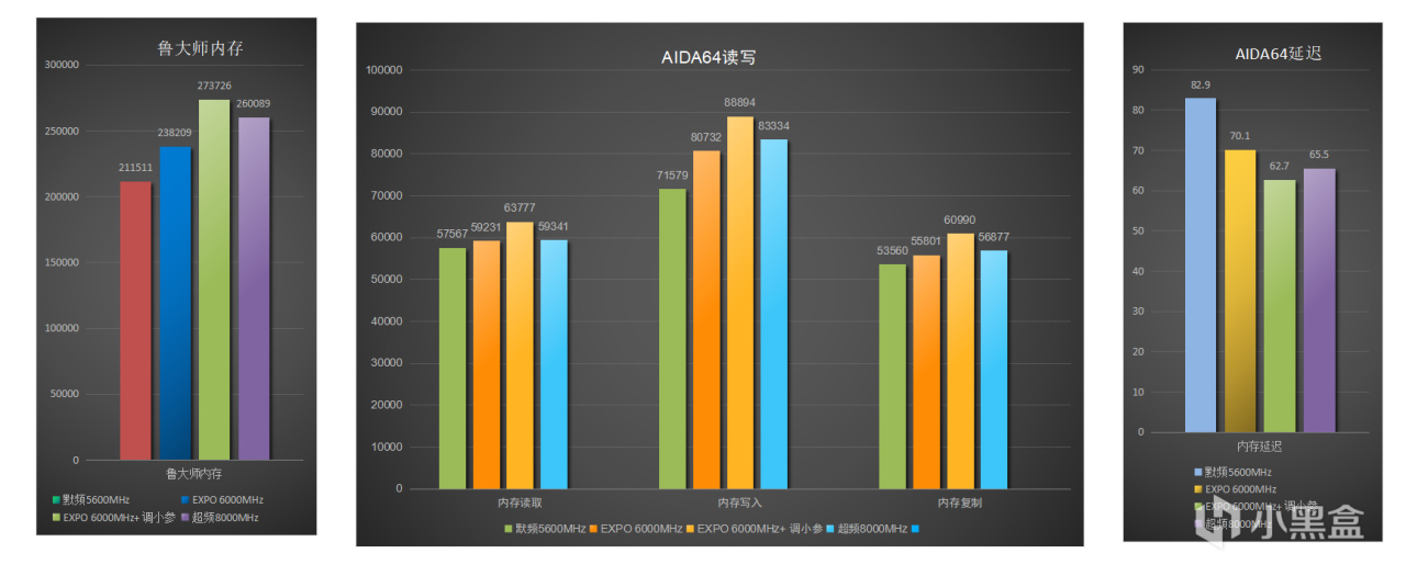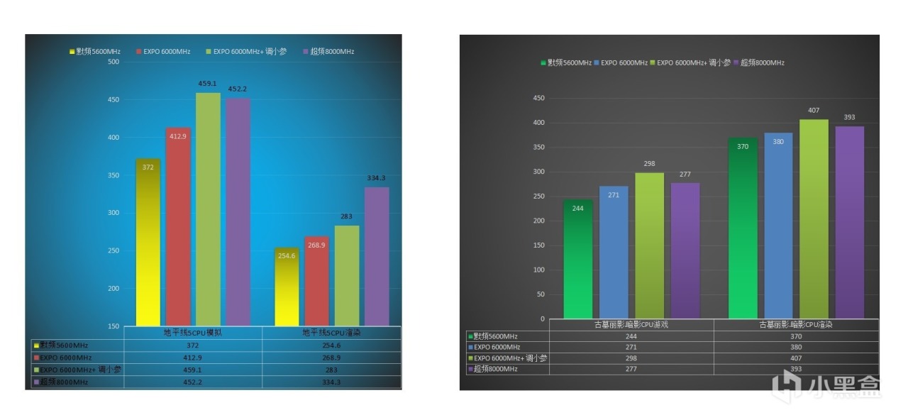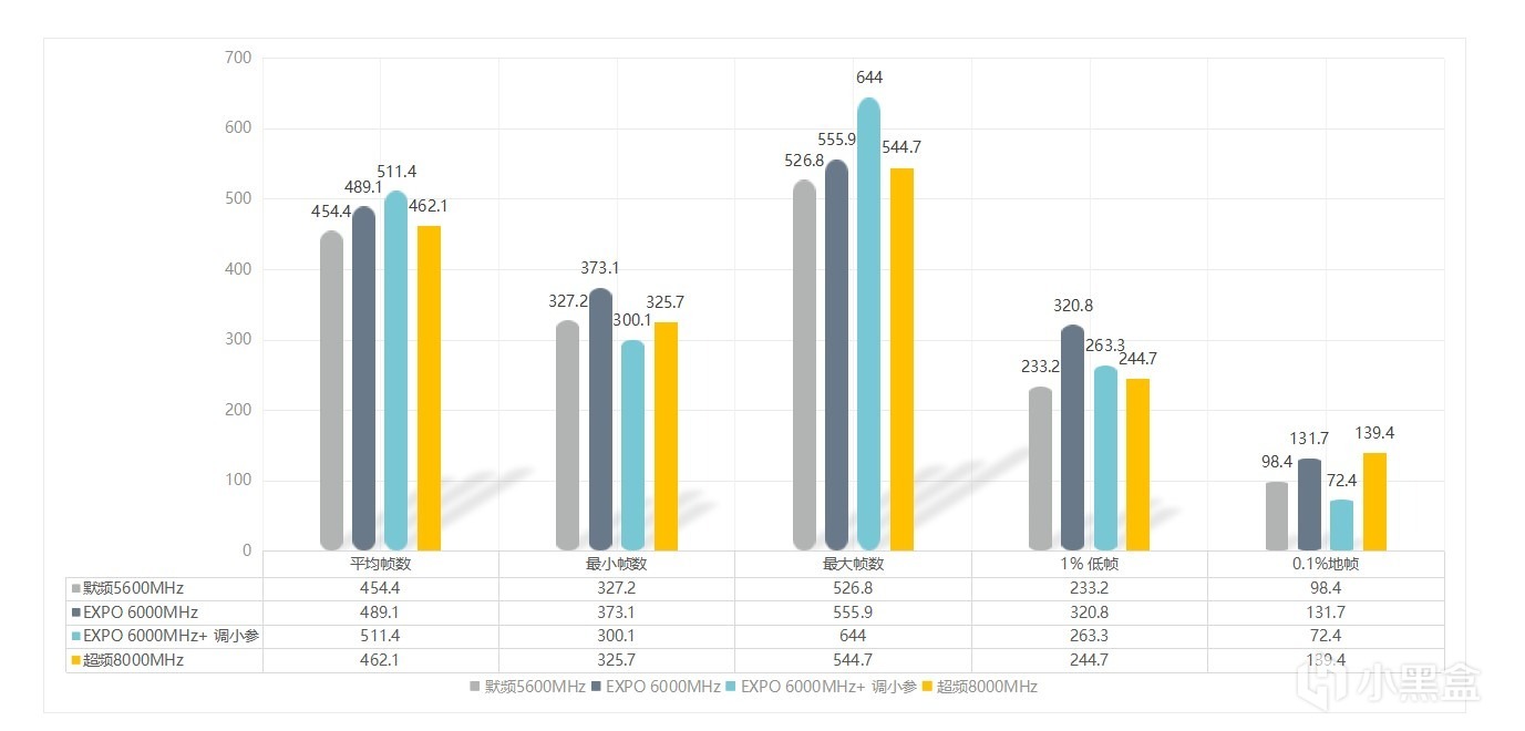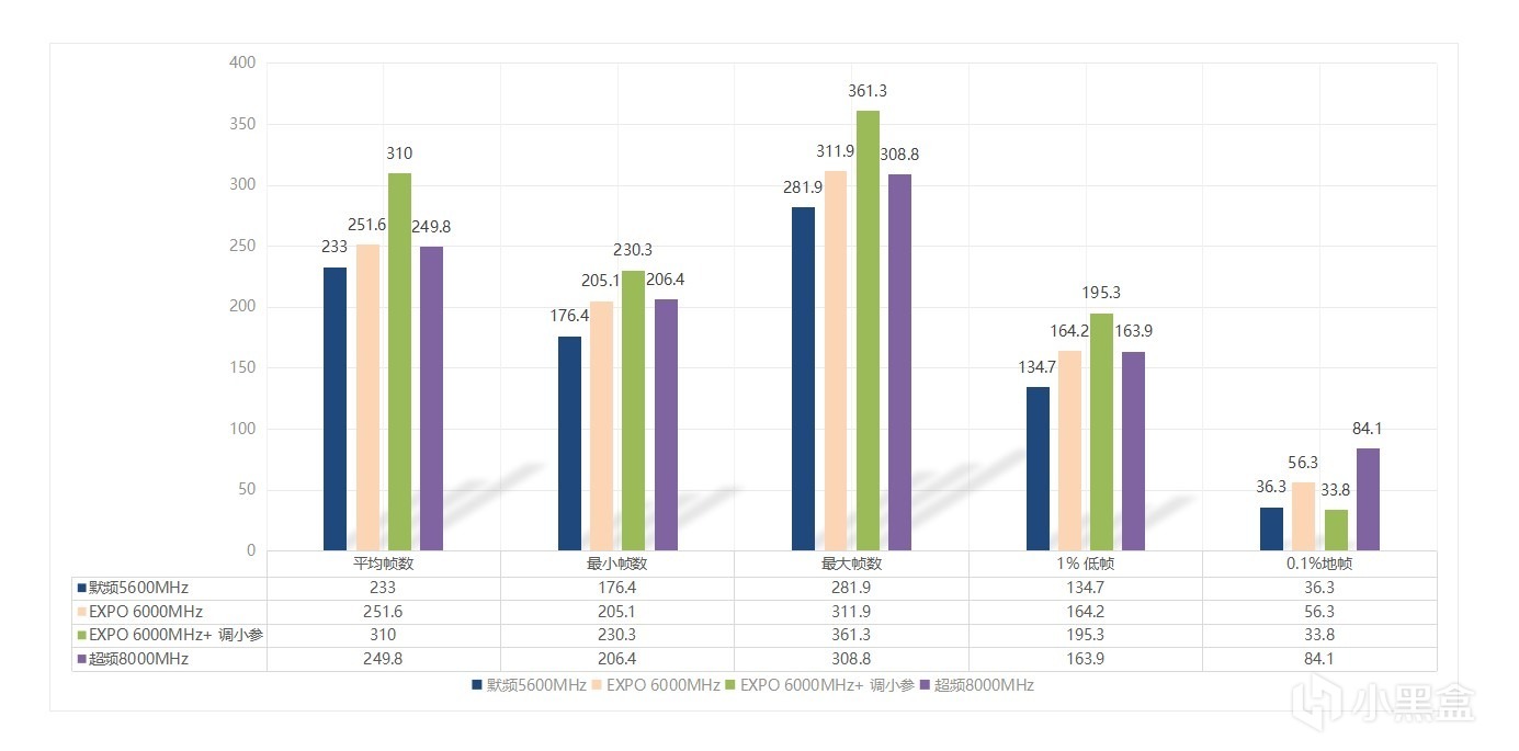 跑分是一方面,游戏里的表现也是非常重要。我们来通过游戏里的测试,来看看默频5600MHz,EXPO6000MHz,EXPO6000MHz+优化小参,超频到8000MHz四个选择下,不同游戏里的表现如何。