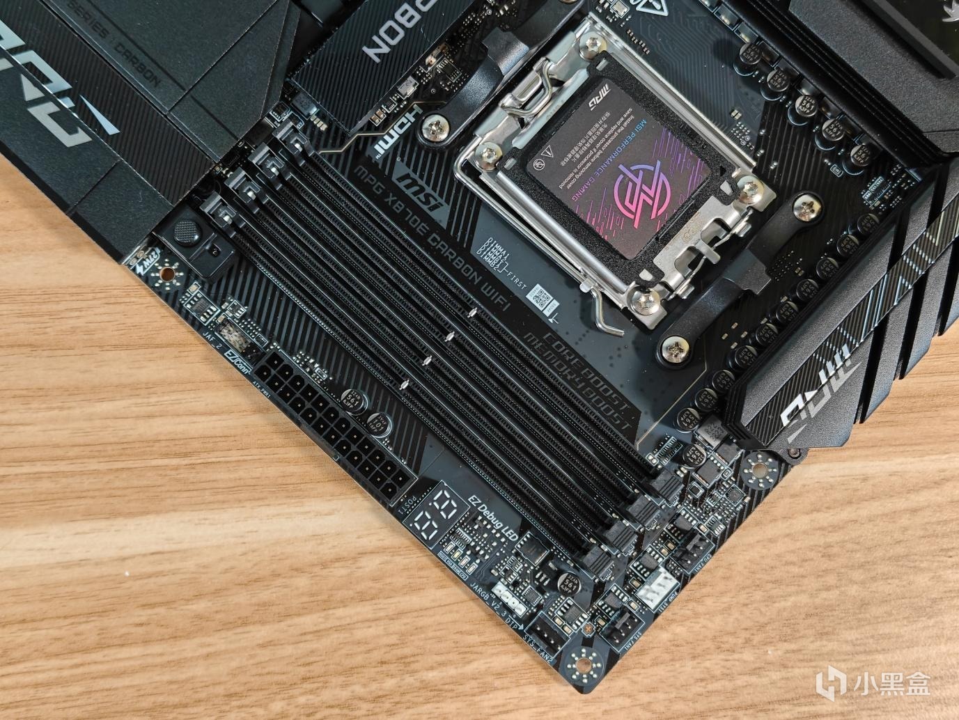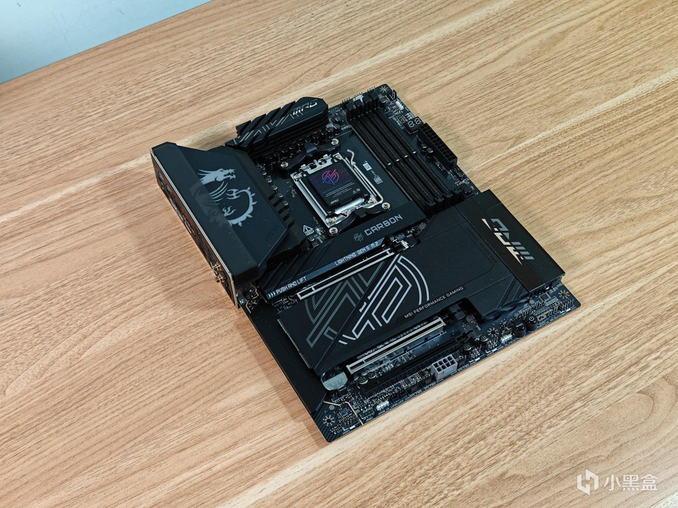 内存的表现,同主板也有一定的关系,我们来简单看下这款微星暗黑主板的情况。整体暗黑色,可以看见有超大面积的散热装甲,并且有龙盾和MPG系列LOGO元素的印记。供电是18+2+1相供110A,应对顶级CPU也没有问题。PCB板采用是8层,服务器级别材料、厚达2盎司铜,用料上乘。 散热方面也很强大,折叠设计的VRM散热装甲,2根热管,高效散热垫等,主板的M.2和南桥上面覆盖了巨大的散热装甲,实现优秀的散热效果。 带有4个M.2插槽,三根PCIE插槽。装甲、M.2插槽均采用快拆式2.0设计,拆装方便。有专用的显卡易拆按钮,拆卸显卡更加容易方便。