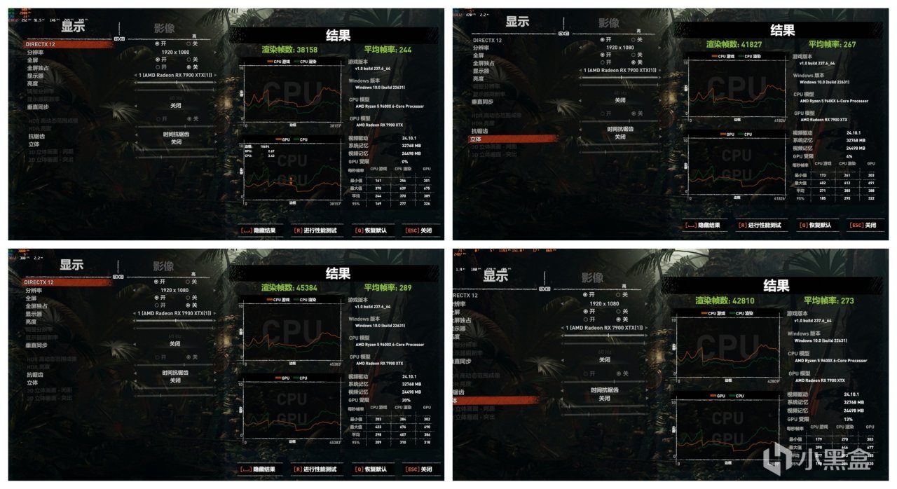 换一个游戏古墓丽影.暗影,内置测试结果,默频5600MHz下的时候,平均帧数CPU游戏244,CPU渲染370;一键EXPO 6000MHz下,平均帧数CPU游戏271,CPU渲染380;一键EXPO 6000MHz+调小参,平均帧数CPU游戏298,CPU渲染407;超频到8000MHz,平均帧数CPU游戏277,CPU渲染393。