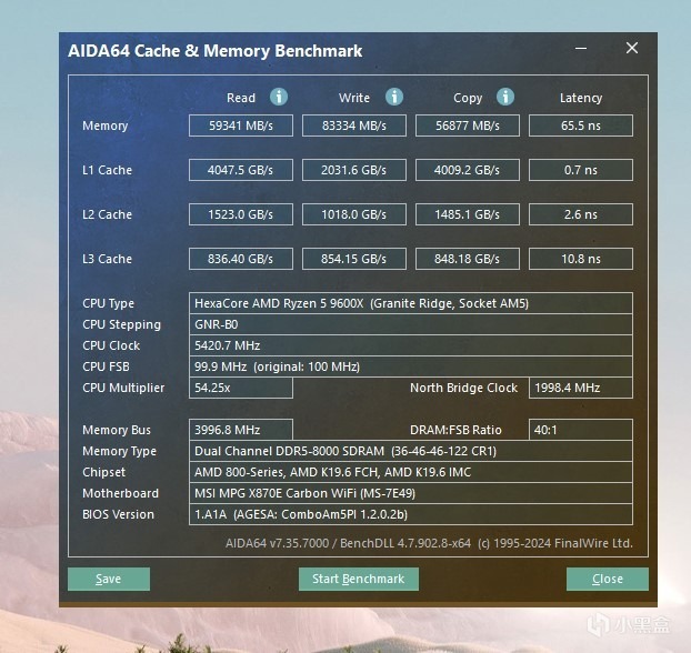运行AIDA64内存测试,读取59341MB/s,写入83334MB/s,复制56877MB/s,延迟65.5ns。延迟比起6000MHz+优化小参还多一些。