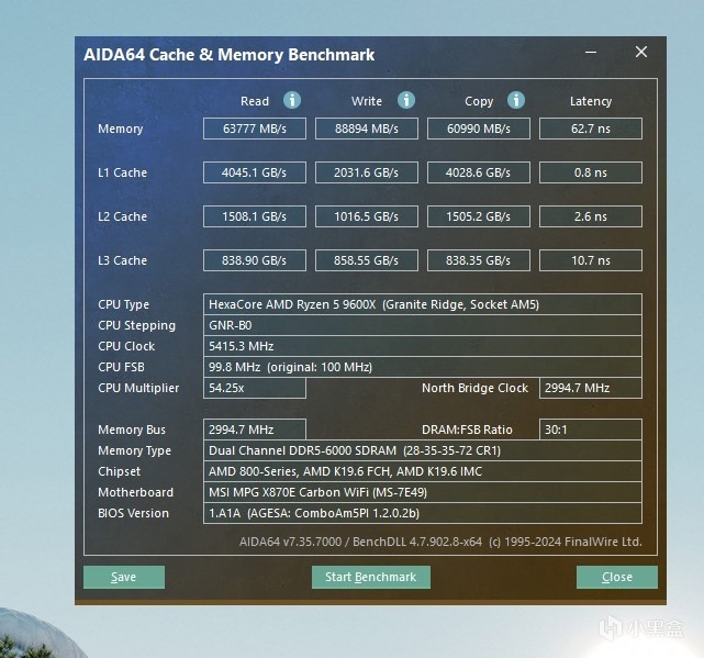 保存重启后再来运行AIDA64,阅读继续增加到了63777MB/s,写入增加到了88894MB/s,复制增加到了60990MB/s,延迟则继续大幅减少到了62.7ns。