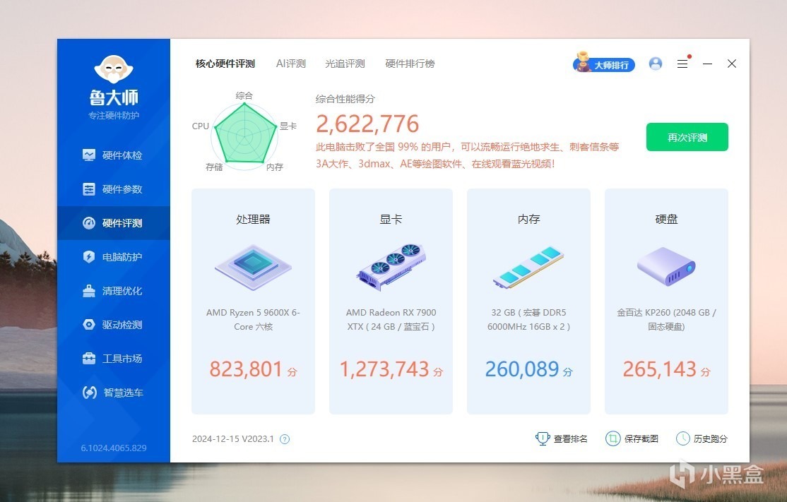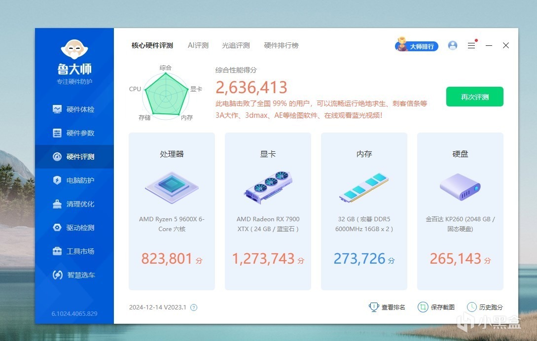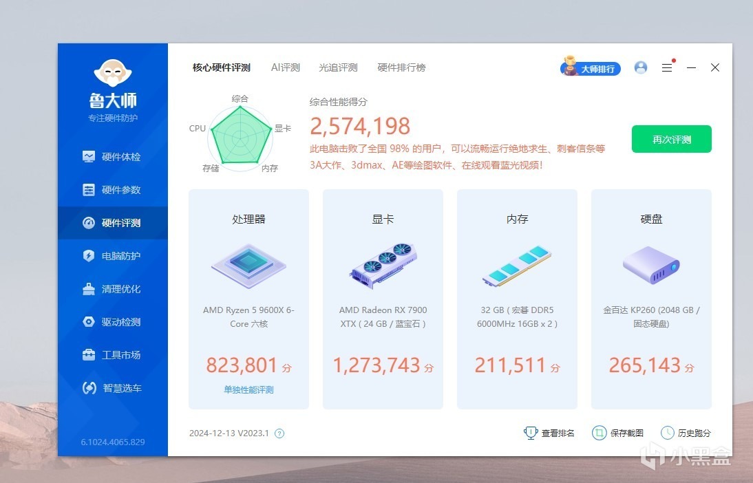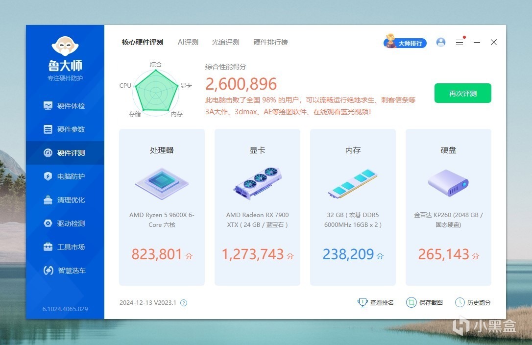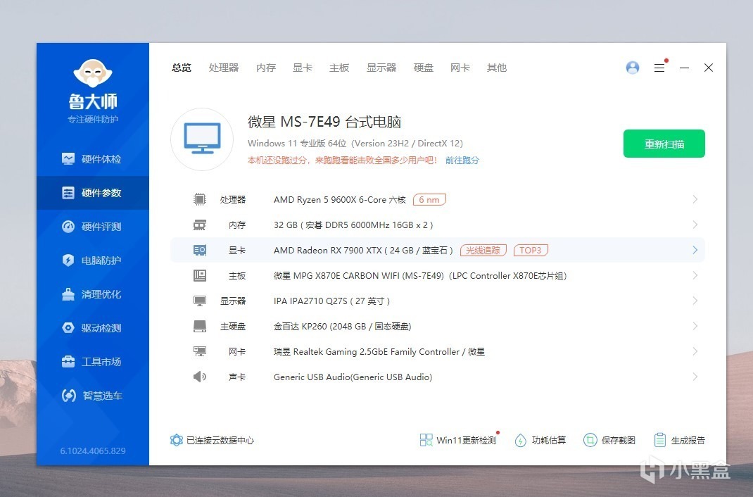 运行鲁大师,看看电脑的配置,CPU是AMD R5 9600X,当然用9800X3D玩游戏更爽,不过现在这个价位有些虚高了。内存是32GB宏碁掠夺者Vesta II 炫光星舰DDR5 6000MHz 16GBx2。显卡是蓝宝石RX 7900XTX 20GB,主板是微星的X870E CARBON WIFI,著名的暗黑主板。