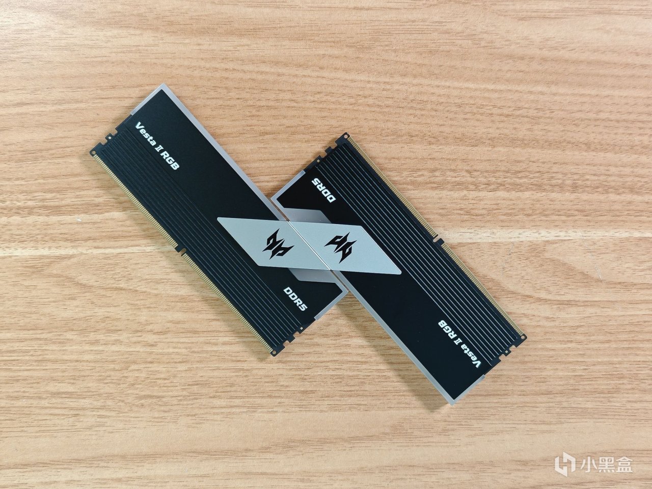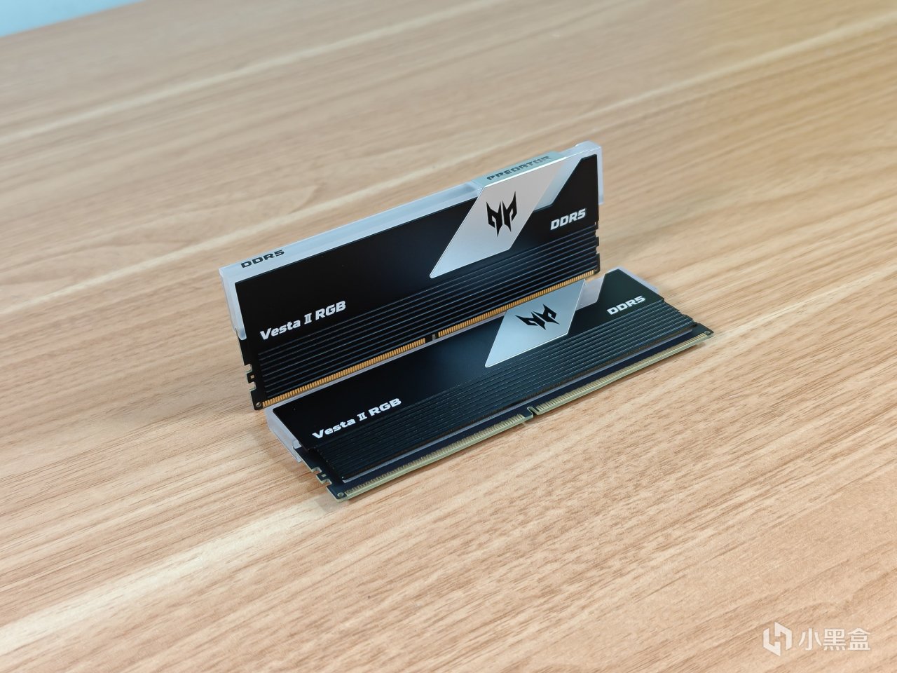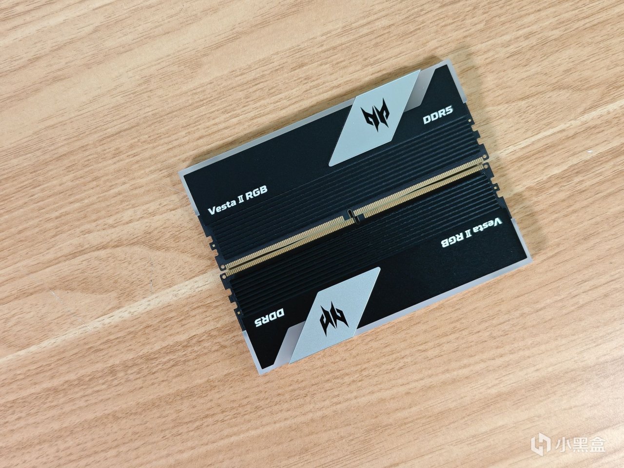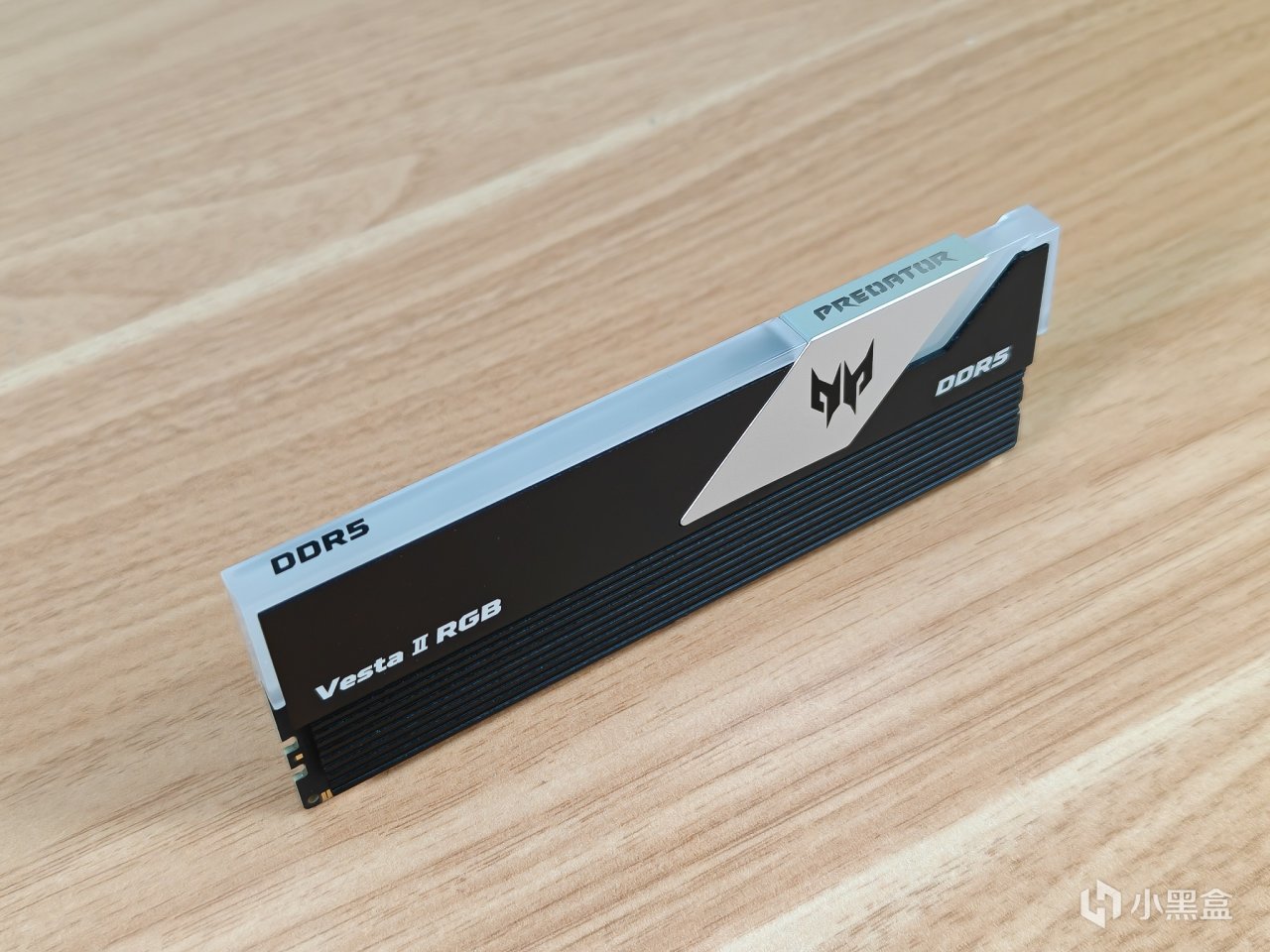 内存条侧面是黑色的金属马甲,棱形的银色部分是掠夺者的标记,性能超强的感觉。左侧写着Vesta II RGB,右侧是DDR5,下方有斜纹,整体高端大气。
