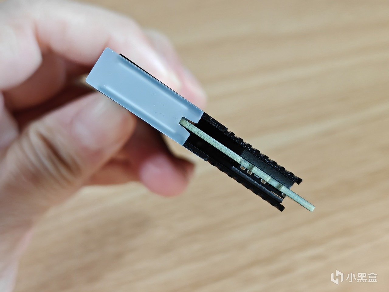 从侧面观察,里面有硅脂散热垫紧贴芯片。这块内存采用了显卡级的高性能硅脂散热垫, 同时使用了2mm厚铝制散热马甲,从而具有很好的散热效果。