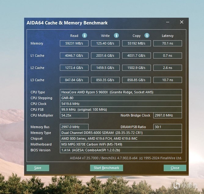 AIDA64内存测试,读取提升到了59231MB/s,在默频5600MHz的时候,读取是57567MB/s。写入提升到了80732MB/s,默频的时候写入71579MB/s,复制55801MB/s,默频的时候是53560MB/s,延迟仅70.1ns,而默频的时候高达82.9ns。由此可见,虽然频率从5600提升到6000MHz不是很大,但是时序的降低却给内存的表现提升不少。