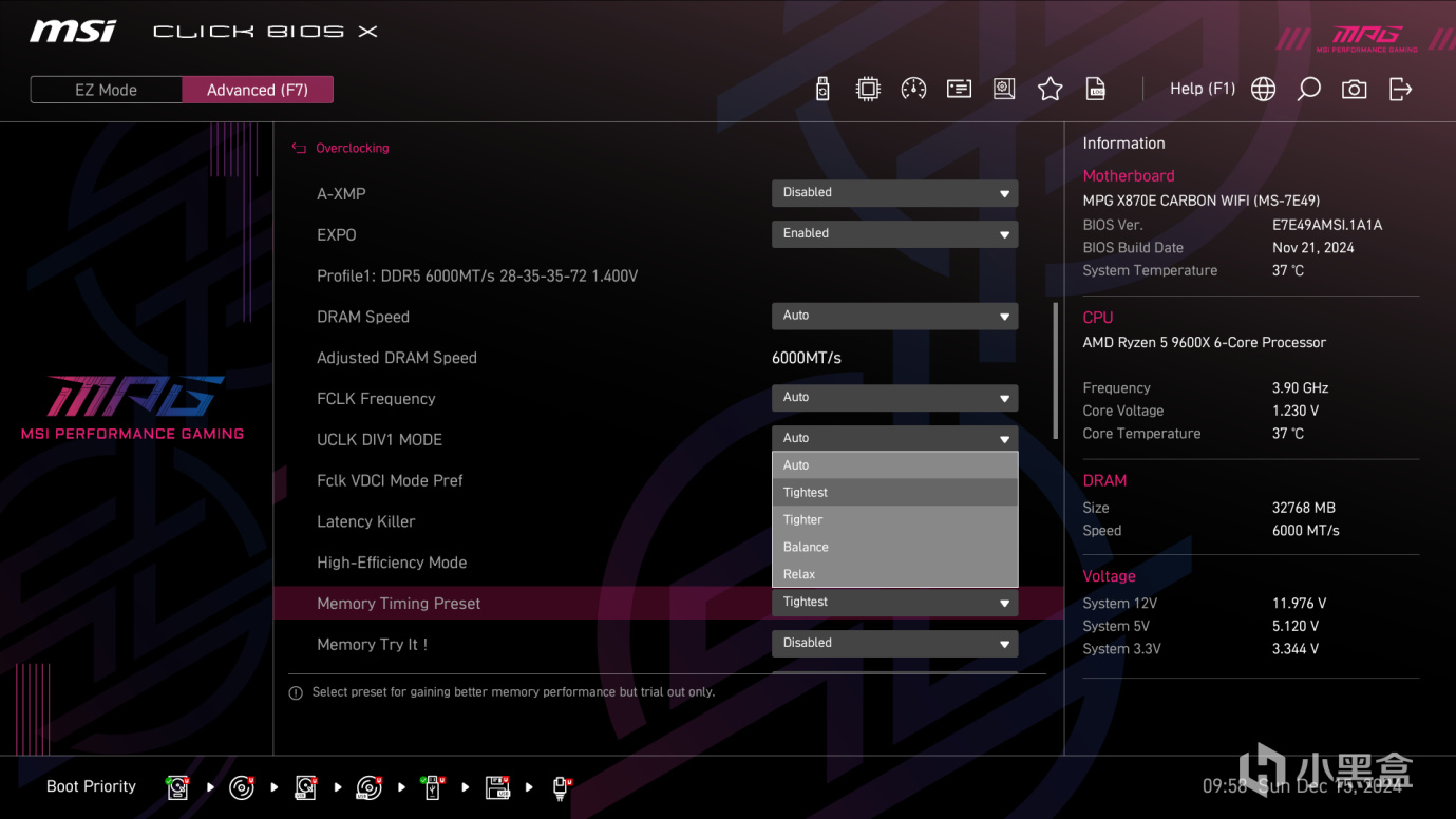 我们说时序是大参数,那么还有很多其他的小参数。普通人调节是搞不懂的,懂一些的搞起来也很费劲费时。而微星的主板具有High-Efficiency Mode,可以自动优化小参数。我们进入主板,选择了这个里面的Tightest模式,来看看调节小参数后的效果。