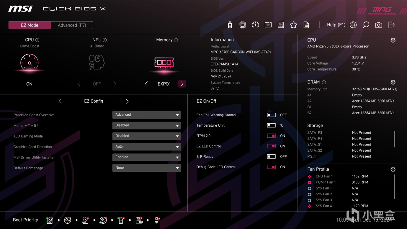 我们重启电脑进入BIOS,在简单界面可以直接选择启用EXPO选项,非常方便。同时,也可以启用CPU的PBO增强功能,这个之前默频的时候我就启用了,然后保存重启。
