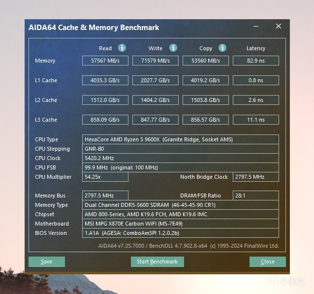 首先我们使用AIDA64的内存测试,在默频5600MHz的时候,时序46-45-45-90,读取57567MB/s,写入71579MB/s,复制53560MB/s,延迟高达82.9ns。