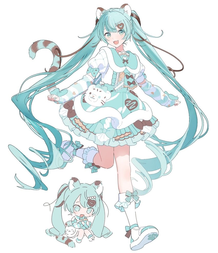 初音未來的形象由KEI設計,她擁有着一頭青翠的短髮[某個綠色頭髮的傢伙越來越藍了],常穿着經典的Vocaloid系列服裝,手持一根象徵性的大蔥。她的設定年齡爲16歲,身高158釐米,體重42公斤,是一個充滿活力與夢想的虛擬少女。(永遠16歲)