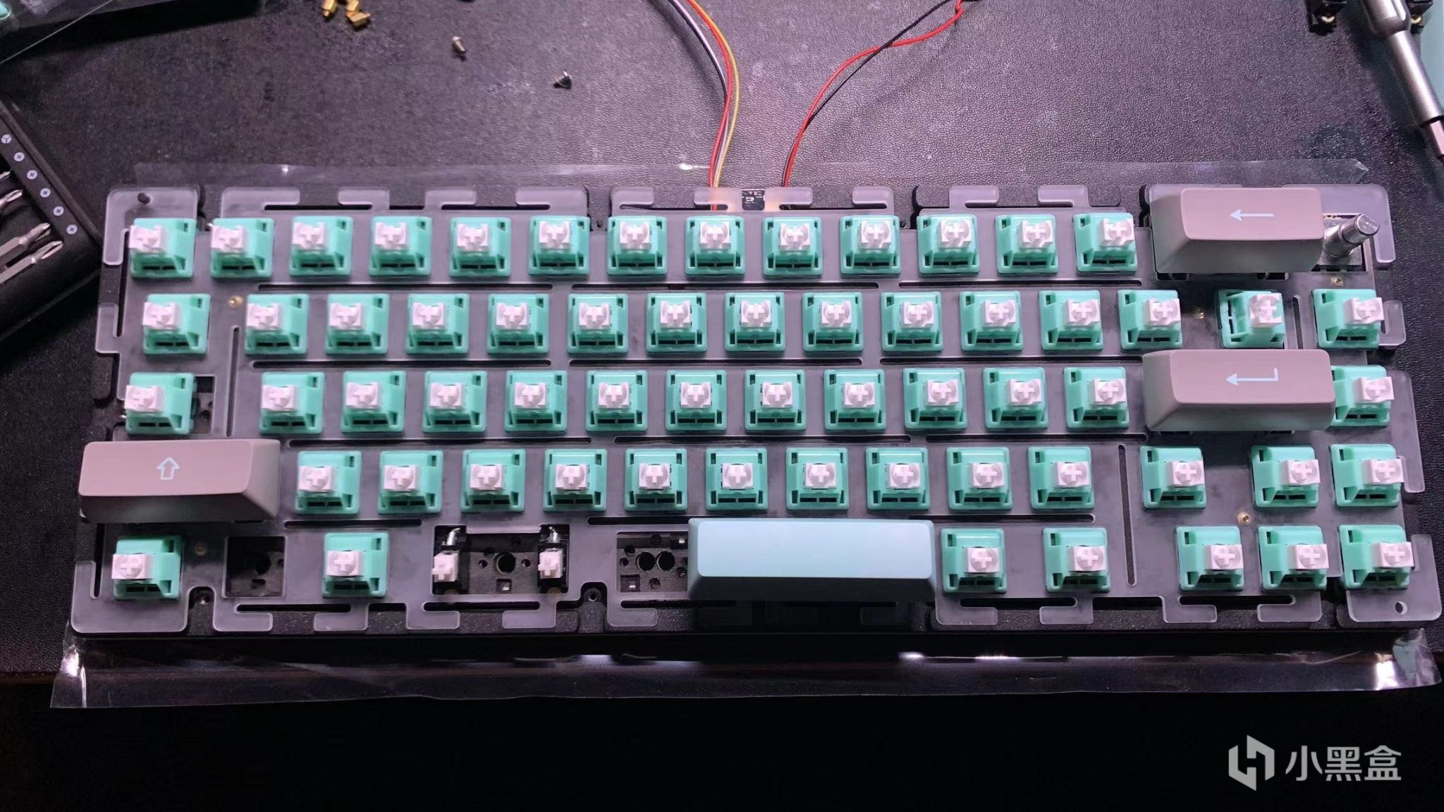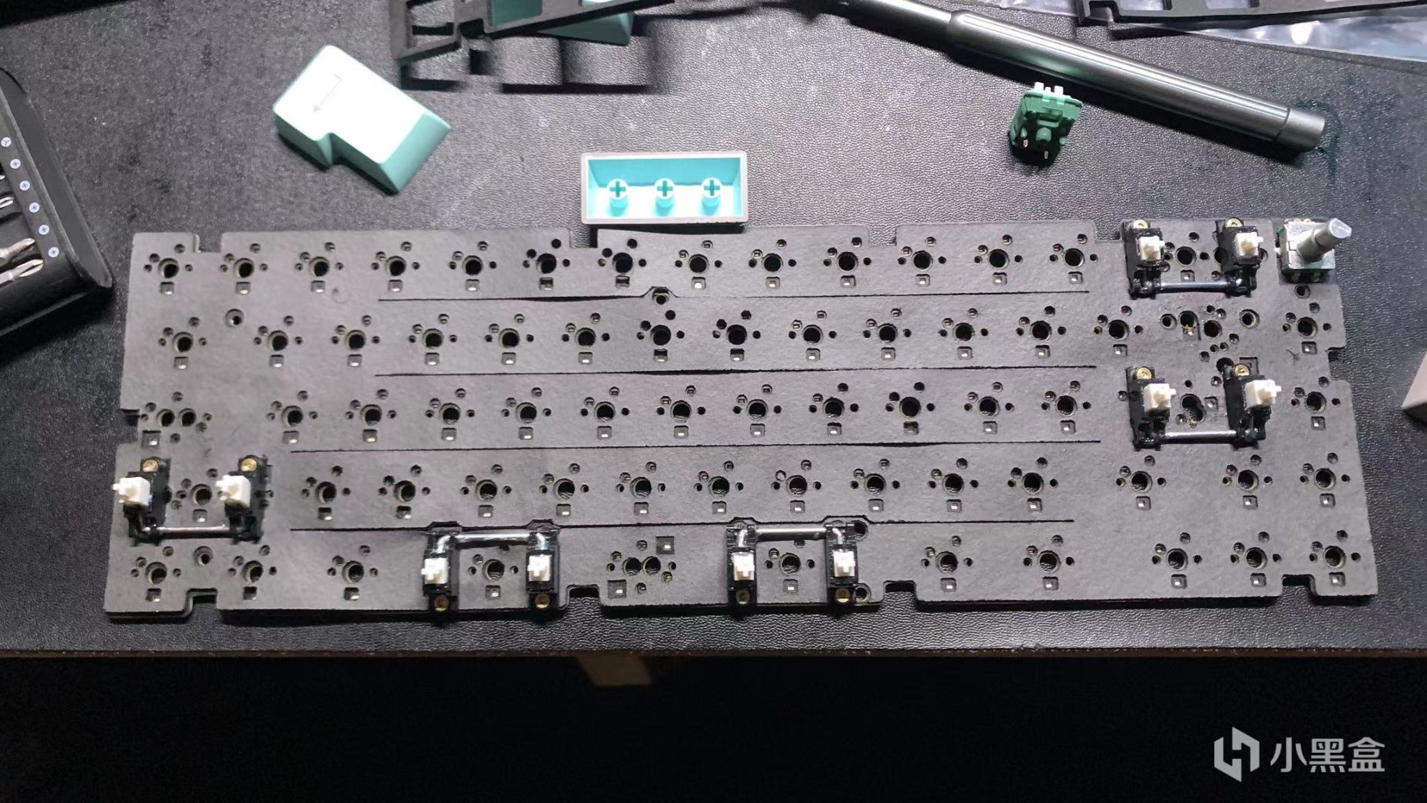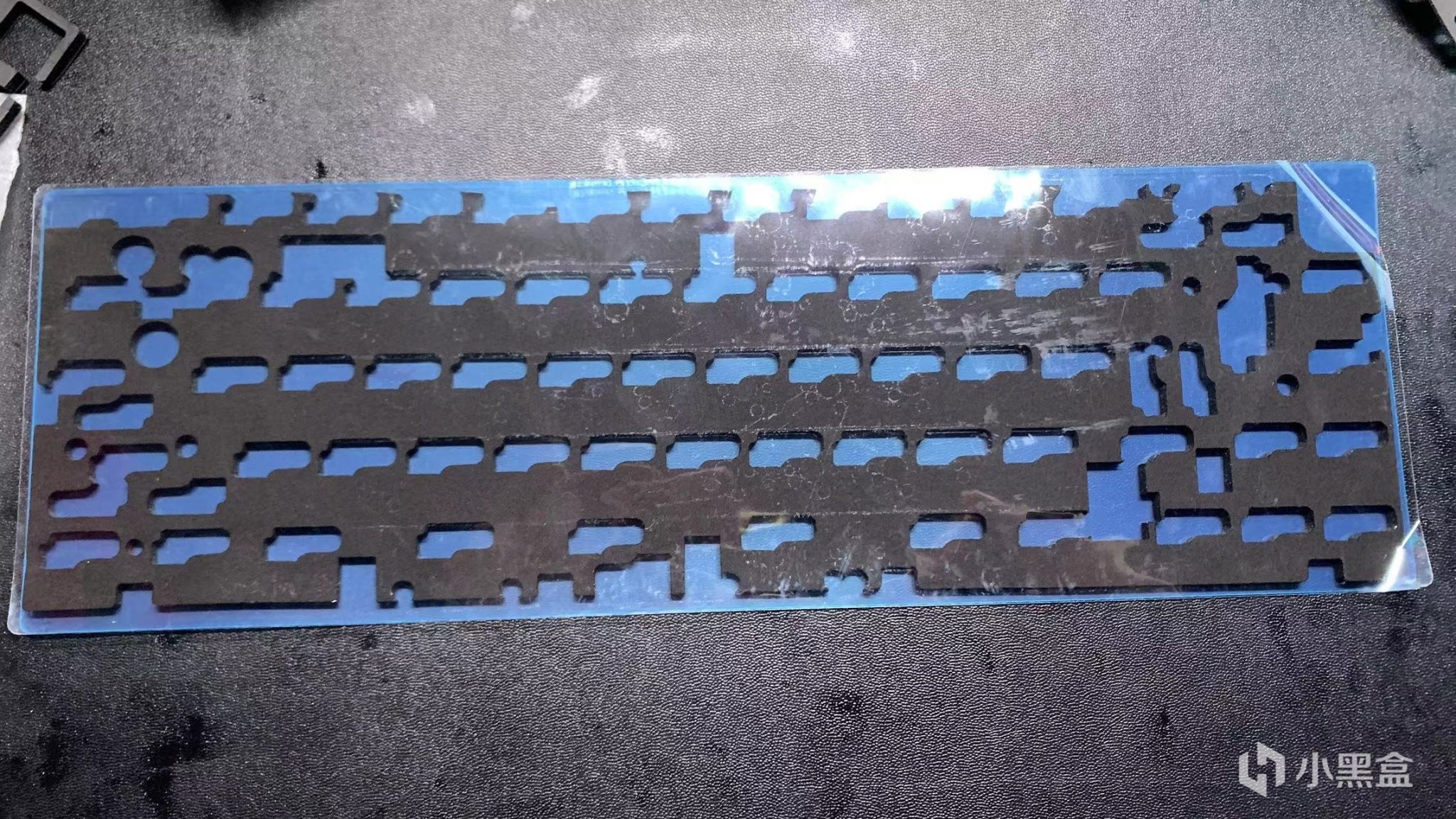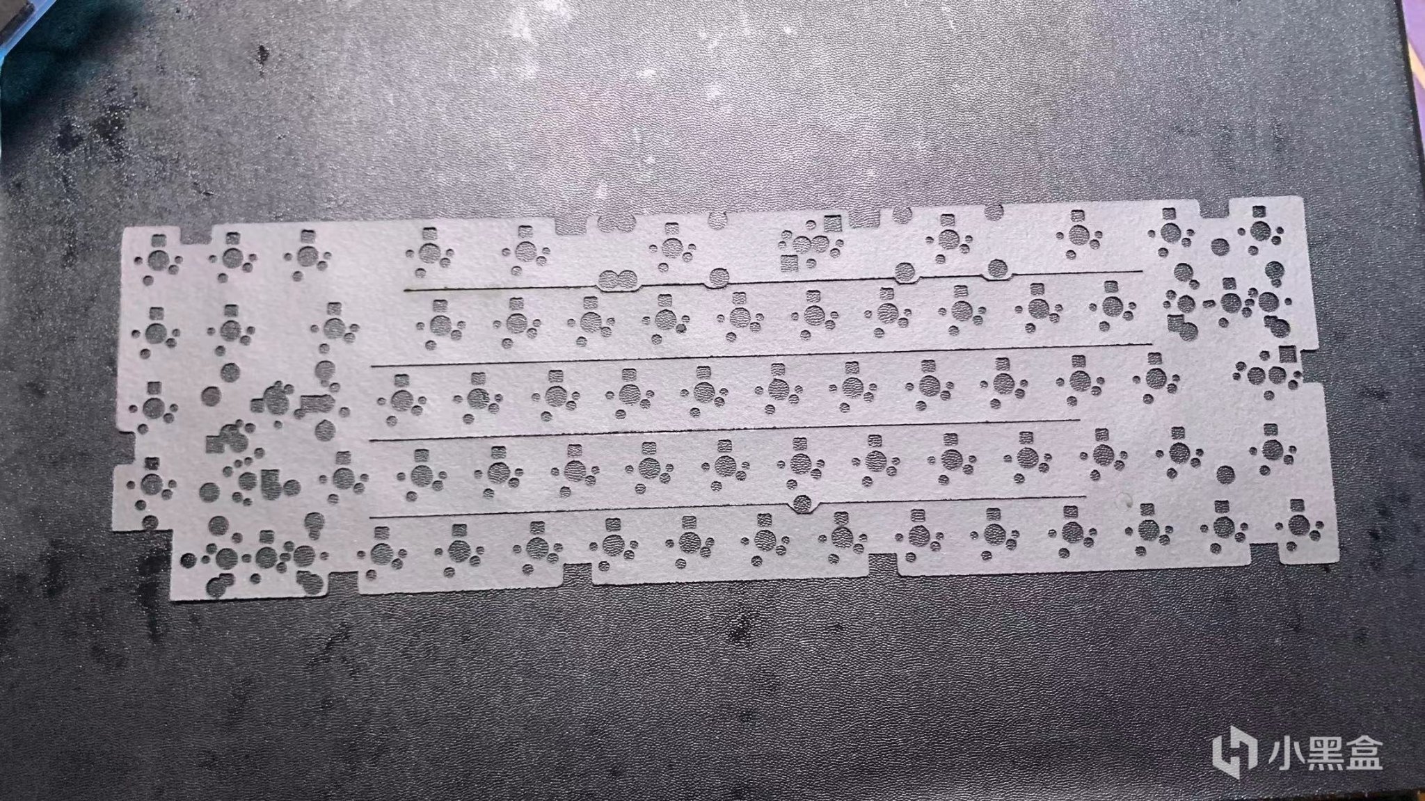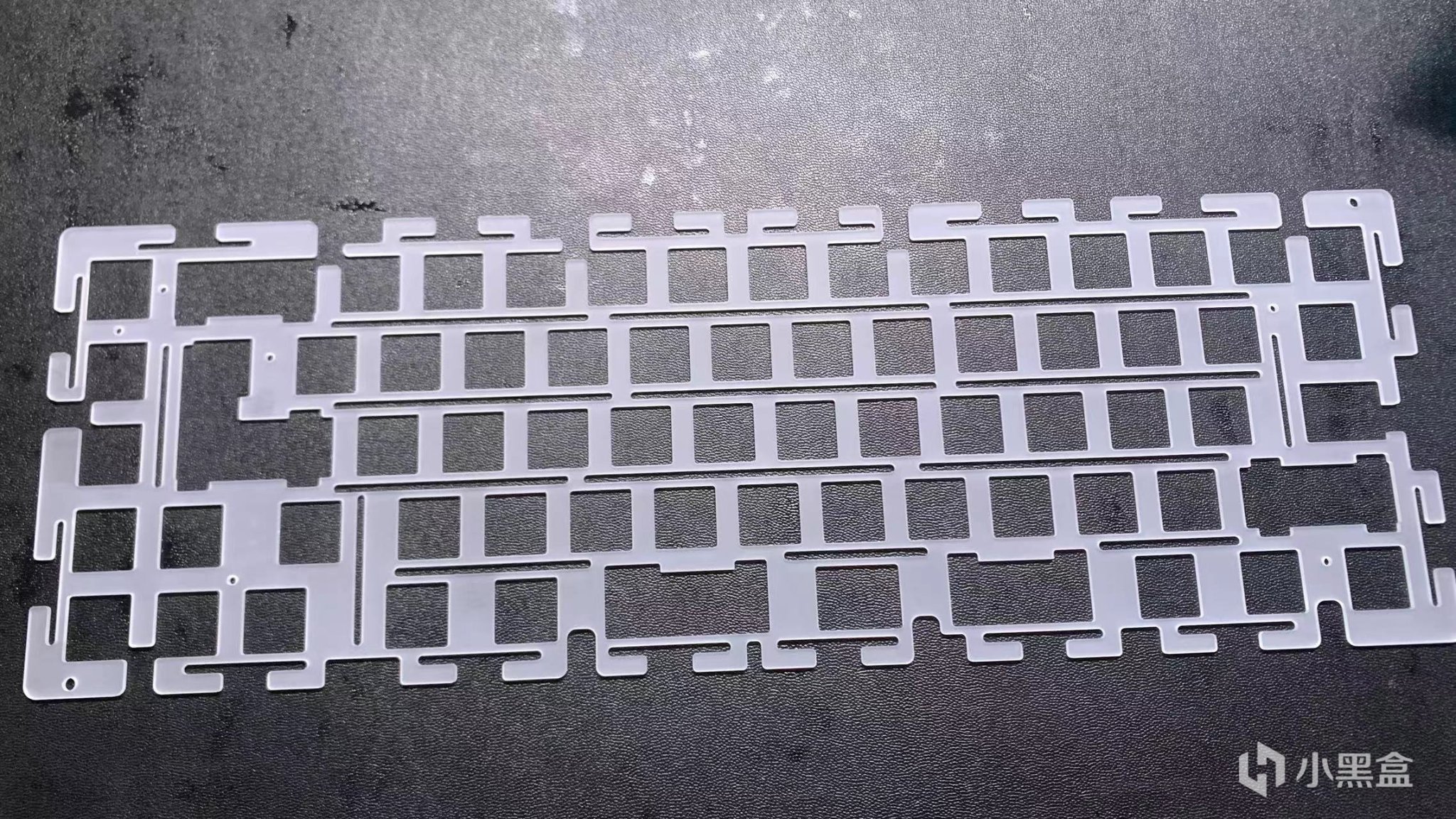 定位板这里是一个开槽的pc定位板,定位板开槽也能让键盘的形变程度变的更高,使键盘变的更软一点,但是这也有一个缺点,那就是在插轴的时候轴体可能会使定位板下陷,这种情况的话我建议各位去用镊子挑起来就可以。