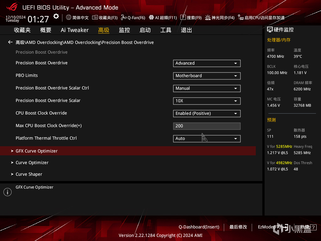 接着在PBO頁面,先調整一套通用參數:PBO選項設置成Adanced模式,設置Scalar Ctrl爲10X和GPU Boost Clock Override爲200MHz(Positve),PBO Limits選擇Motherboard即可。當然如果覺得以下Curve Shaper操作過於複雜,也可以用Curve Optimier,直接全核正壓開始摸皆可,負壓的話應該要體質很好才能達得到。