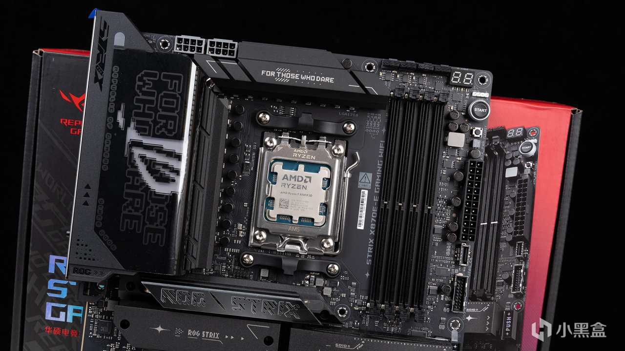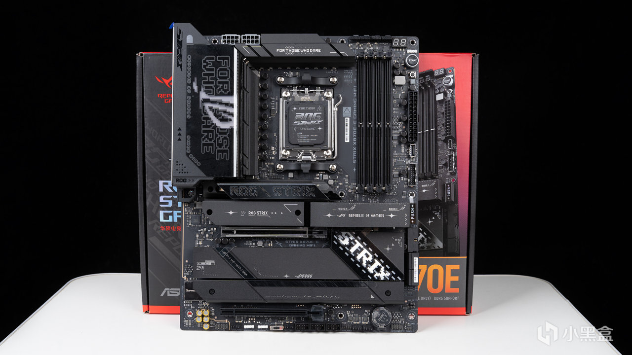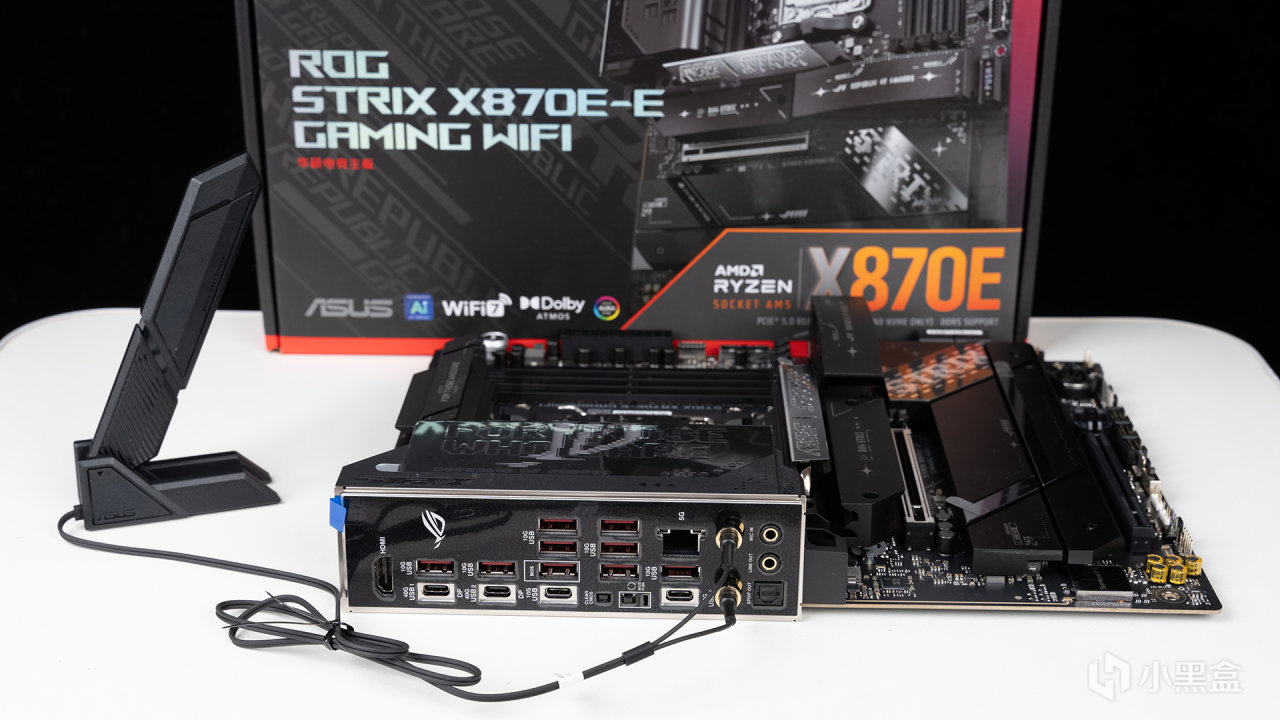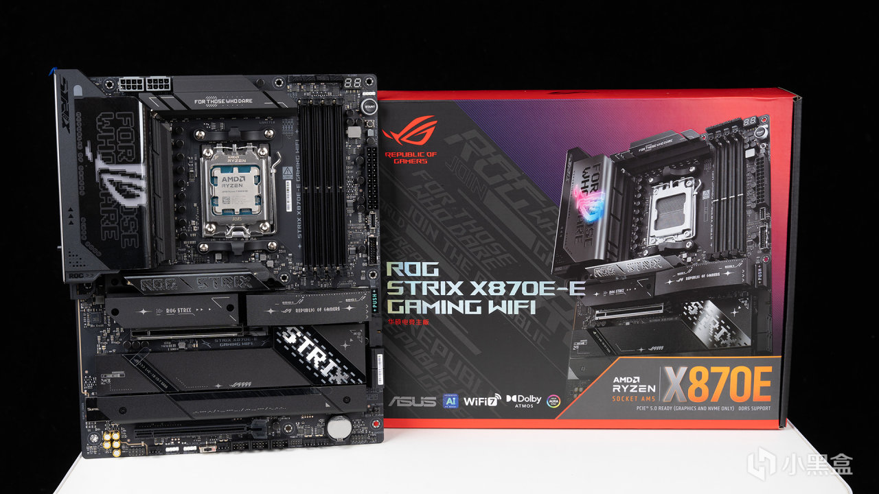ROG STRIX X870E-E包裝是採用玩家國度一貫的高端範風格,正面僅有主板渲染圖印花、型號相關標註,具體的詳細賣點都藏在了包裝背面。