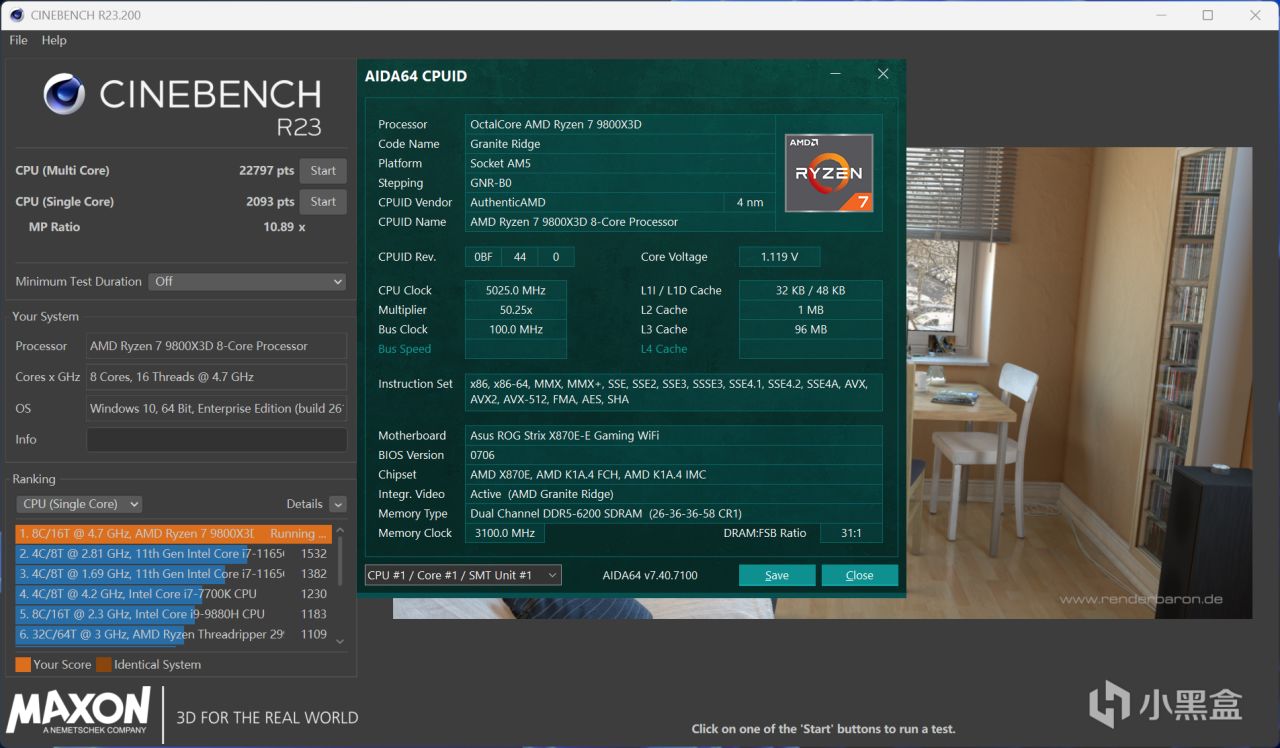CINBENCH R23,銳龍7 9800X3D多核得分22797 pts,單核得分2093 pts