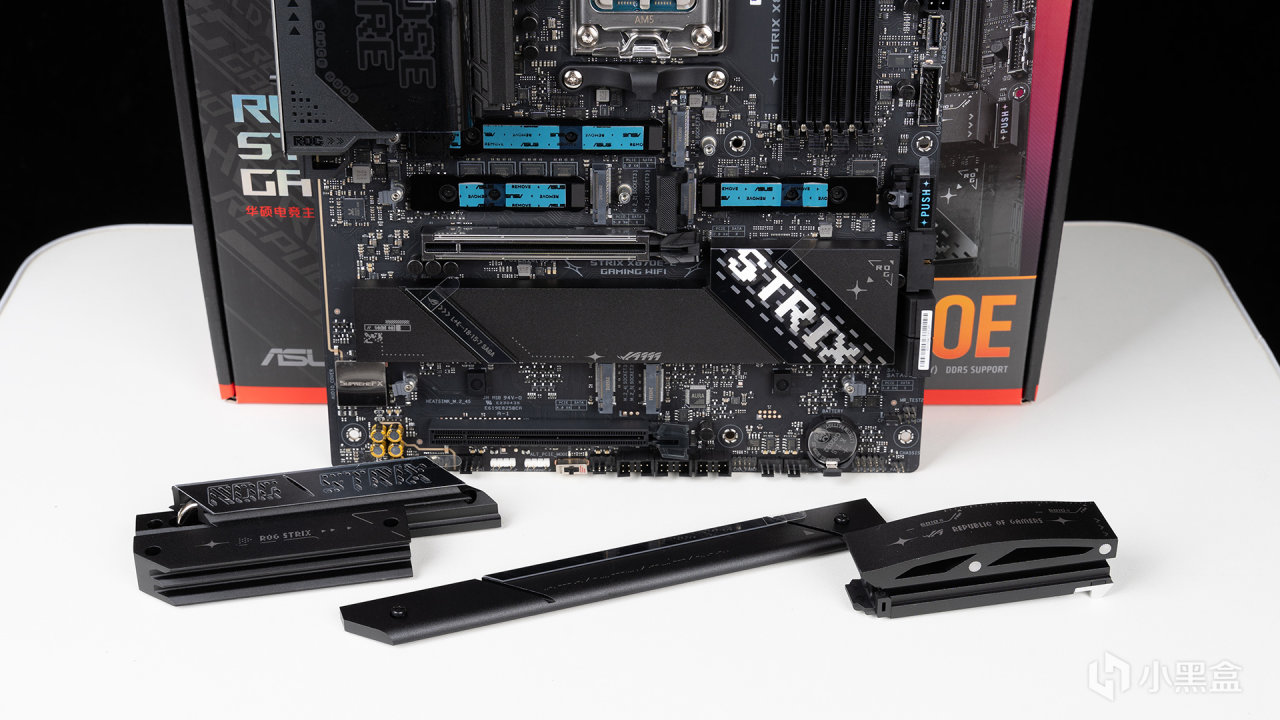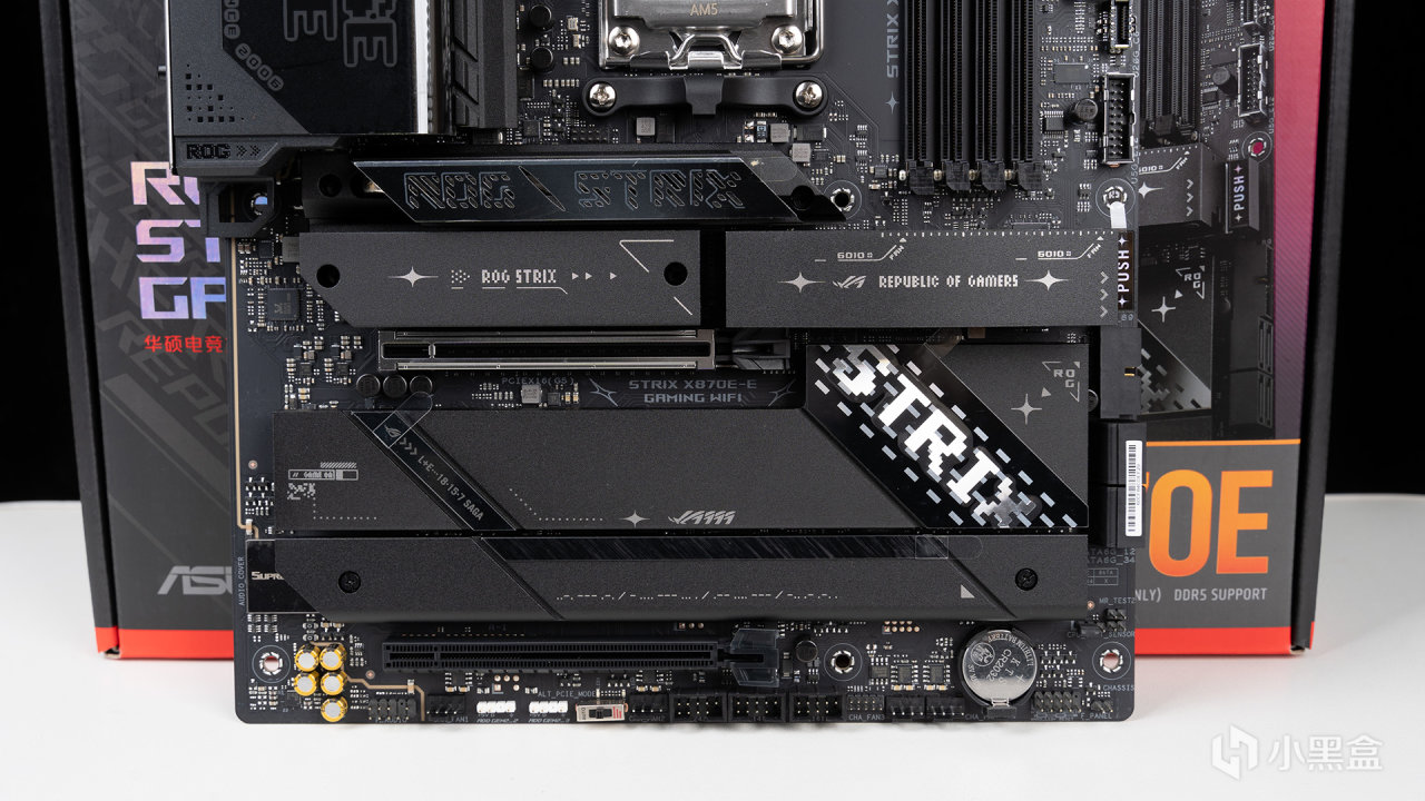 ROG STRIX X870E-E配備兩組全長擴展槽,顯卡插槽支持PCIe 5.0X16模式,並擁有金屬加固且插槽採用創新的易拆裝設計,無需按下卡扣即可卸下顯卡,下方一組則是支持PCIe 4.0X4。主板覆蓋全面的M.2散熱裝甲,拆下來就能看到一些玄機設計。