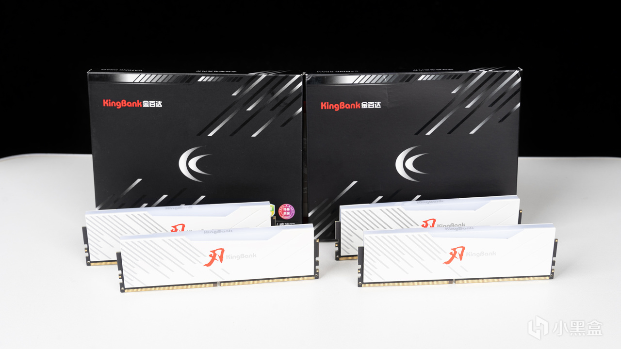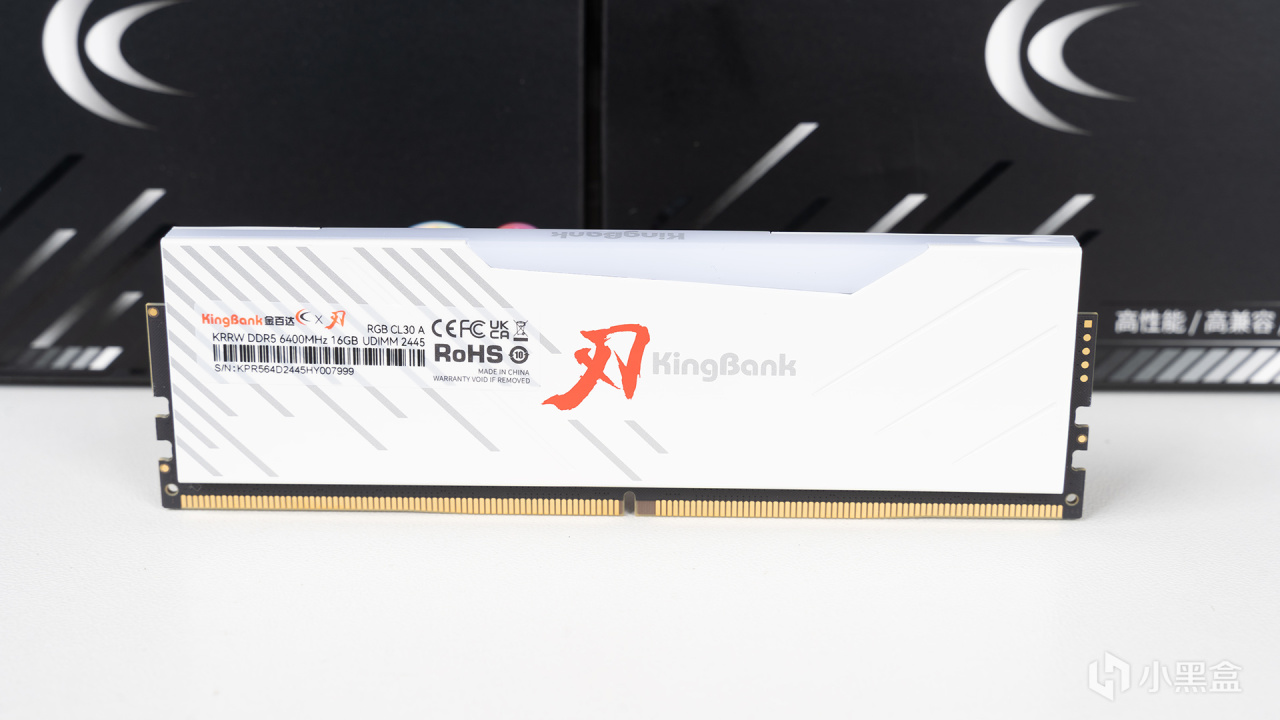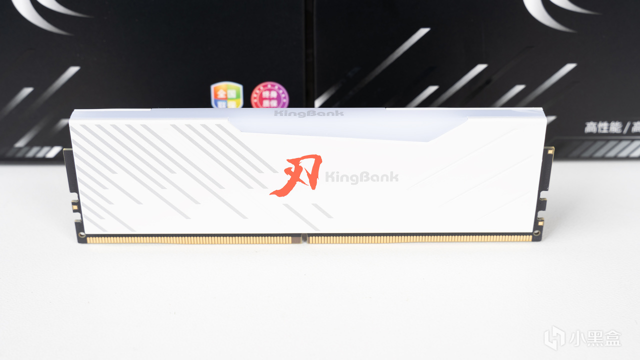我們就來單獨看下這款刃RGB DDR5 6400C30 16GB*2內存套裝,內存由2mm厚度的馬甲散熱片包夾,表面有大大的紅色“刃”字和KingBank LOGO加持之餘,也有一些斜向紋路裝飾,質感摸上去也是相當溫潤,用來適配白色海景房方案再適合不過。
