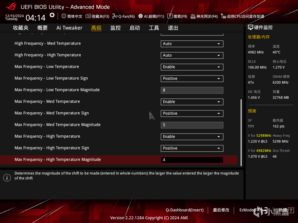 對於臭打遊戲的9800X3D用戶來說相對操作簡單些,找到Max Frequency——Low/Med/High三組選項選擇Enable開啓(其他頻段不用管),這個頻段可以完美對應上游戲場景,因爲PBO已經加了200MHz,再疊加106外頻,能達成的CPU頻率已經相對高了,所以從正壓開始嘗試可以減少彎路。