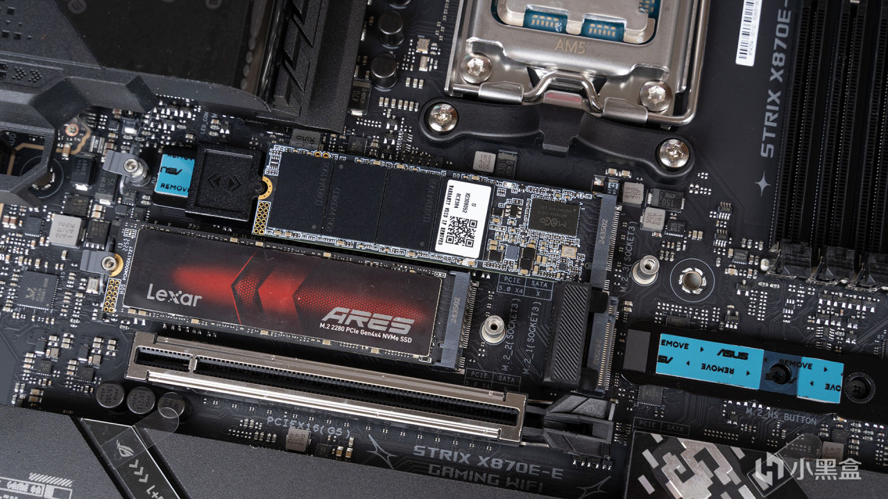 移除裝甲後能看到主板是配備五組M.2插槽,上方三組最高支持GEN 5X4模式,下方兩組則是最高支持GENX4,擴展性豐富,散熱裝甲分配得也相當合理——顯然GEN 5固態發熱量高得多,所以散熱裝甲設計也是重裝類型。