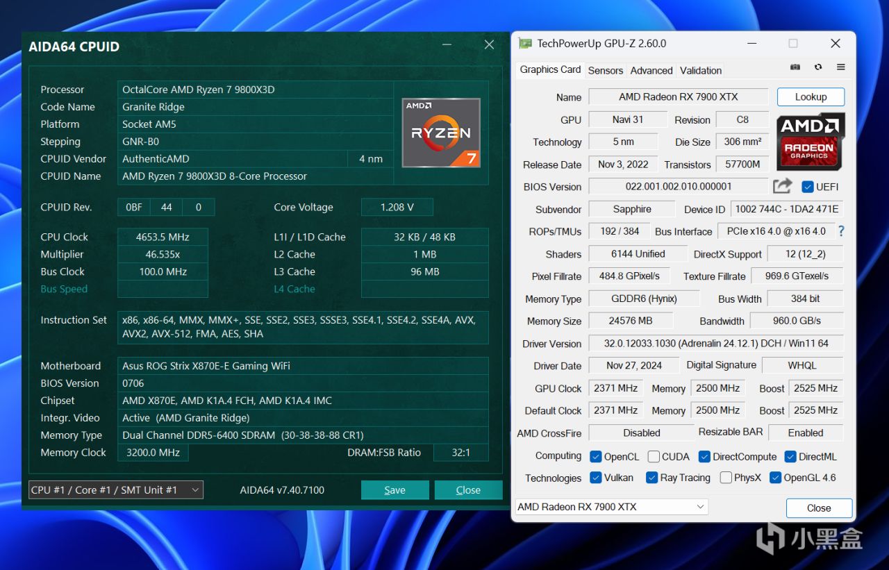 簡單介紹一下測試配置和環境,銳龍7 9800X3D使用一組PBO ENABLE模式作爲數據對比,由於體質不達標,內存開啓EXPO超頻後再將頻率調整爲6200MHz,顯卡藍寶石RX 7900 XTX白金版,安裝最新AMD Adrenalin 24.12.1顯卡驅動,並開啓Resizable RAR技術最大化顯卡性能,操作系統是Windows 11 24H2最新版本。