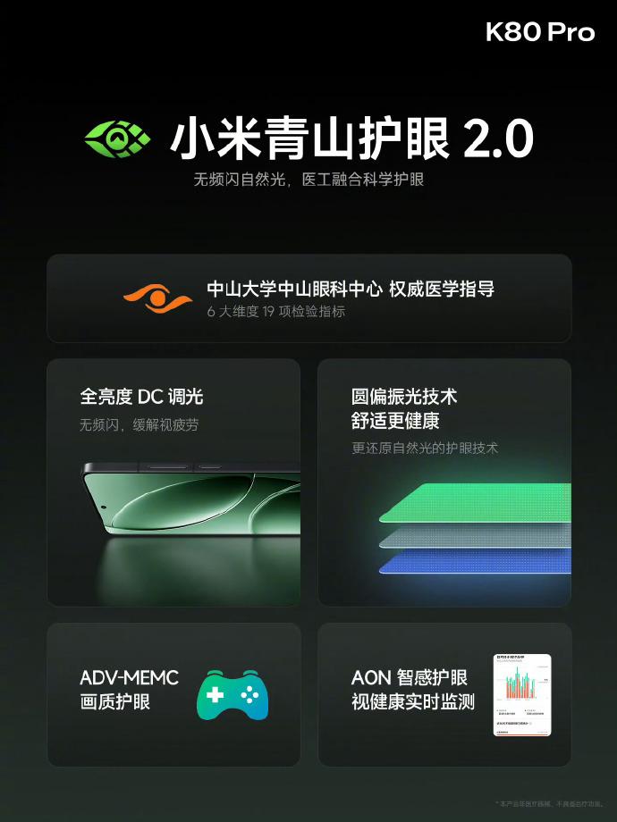 REDMI K80系列首发搭载小米青山护眼2.0,其采用全亮度DC调光和圆偏振光技术,这是行业内首款同时实现这两项技术的2K屏幕。