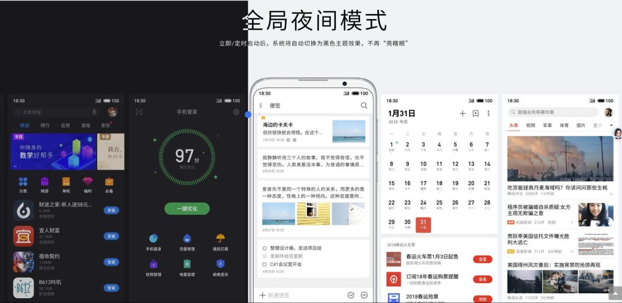 2018年,魅族正式发布了Flyme 7,引入了全局夜间模式,不管是系统界面,还是第三方APP,它都能将其变成夜间模式,从而减少夜间长时间玩手机对眼睛造成的损害。