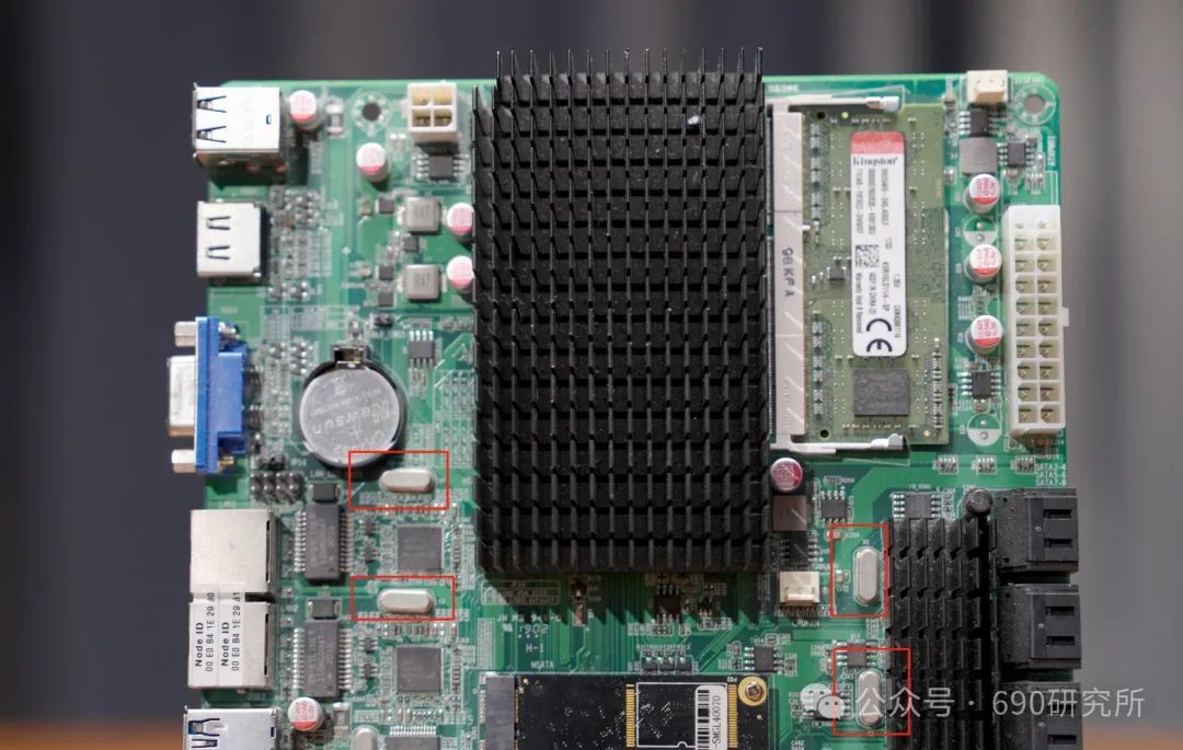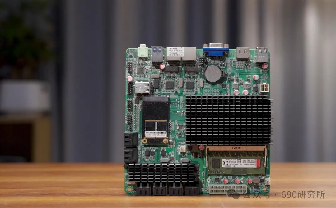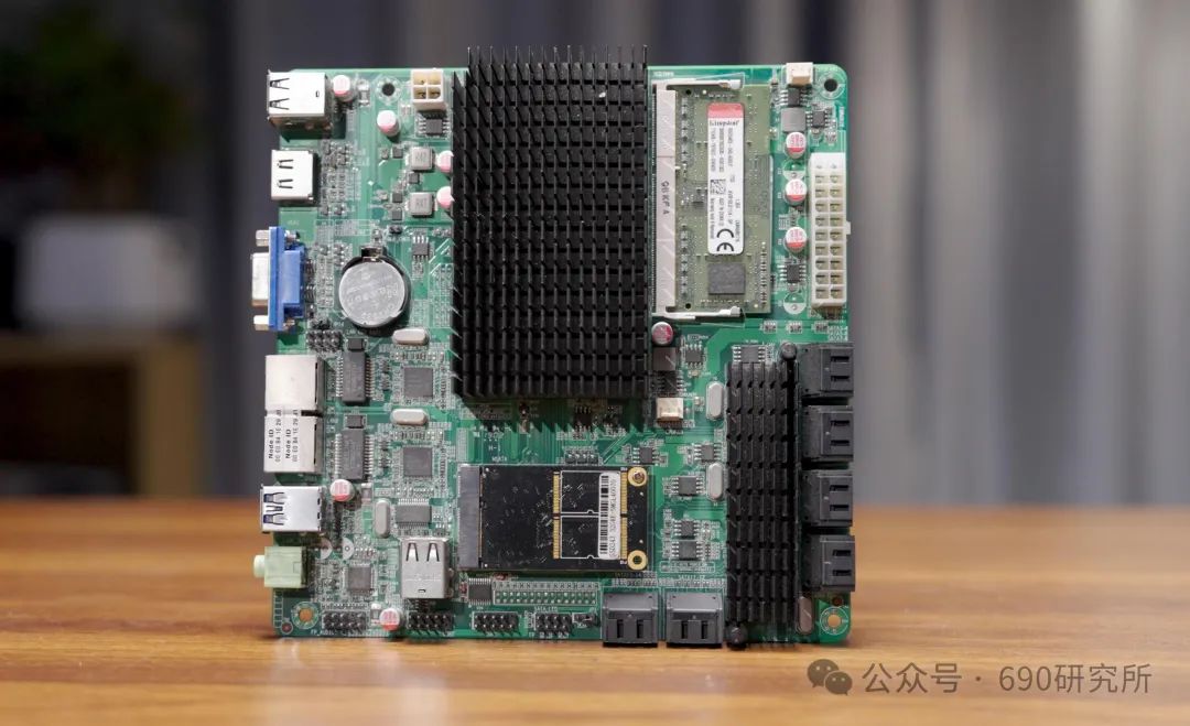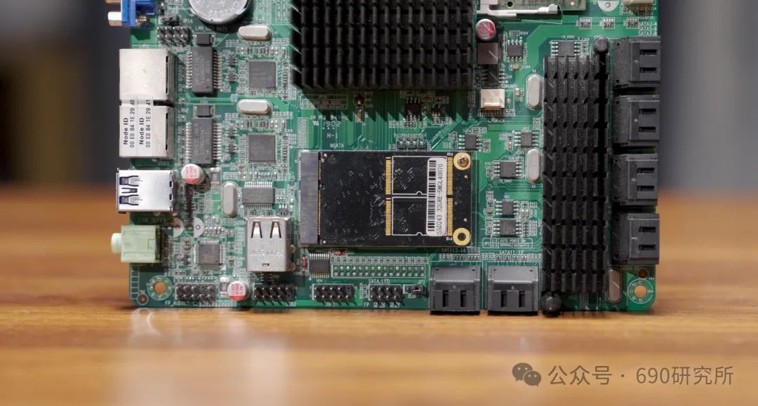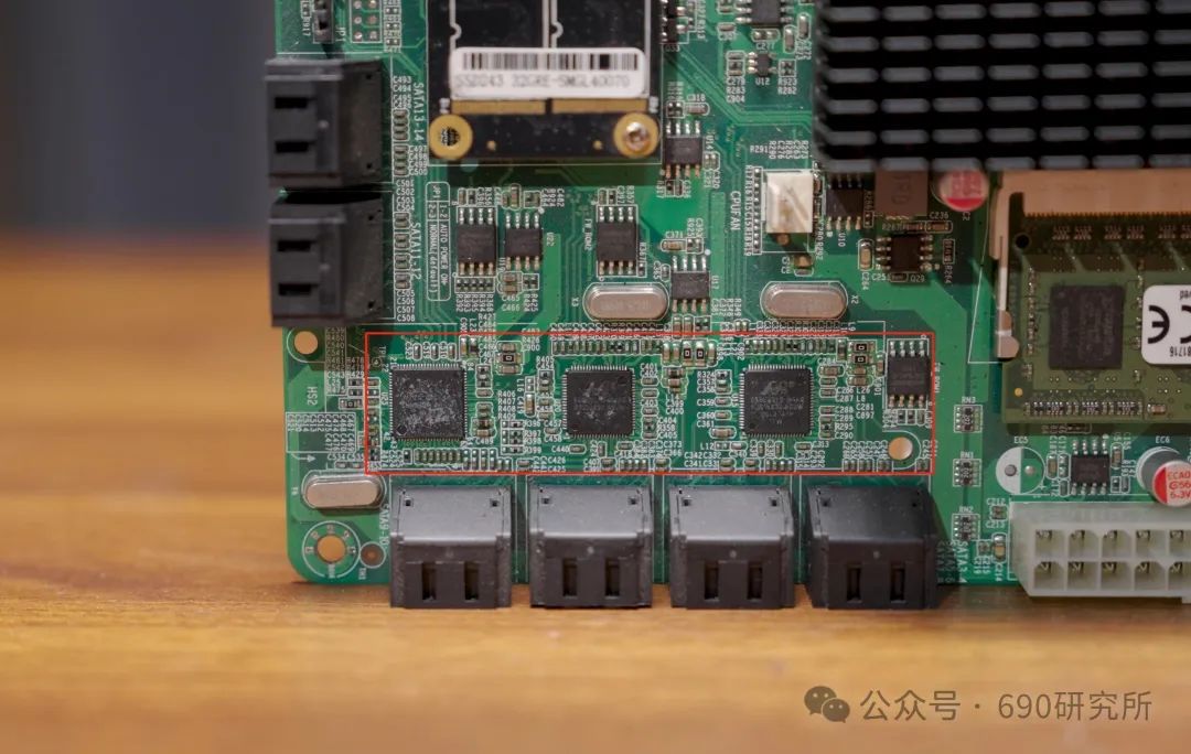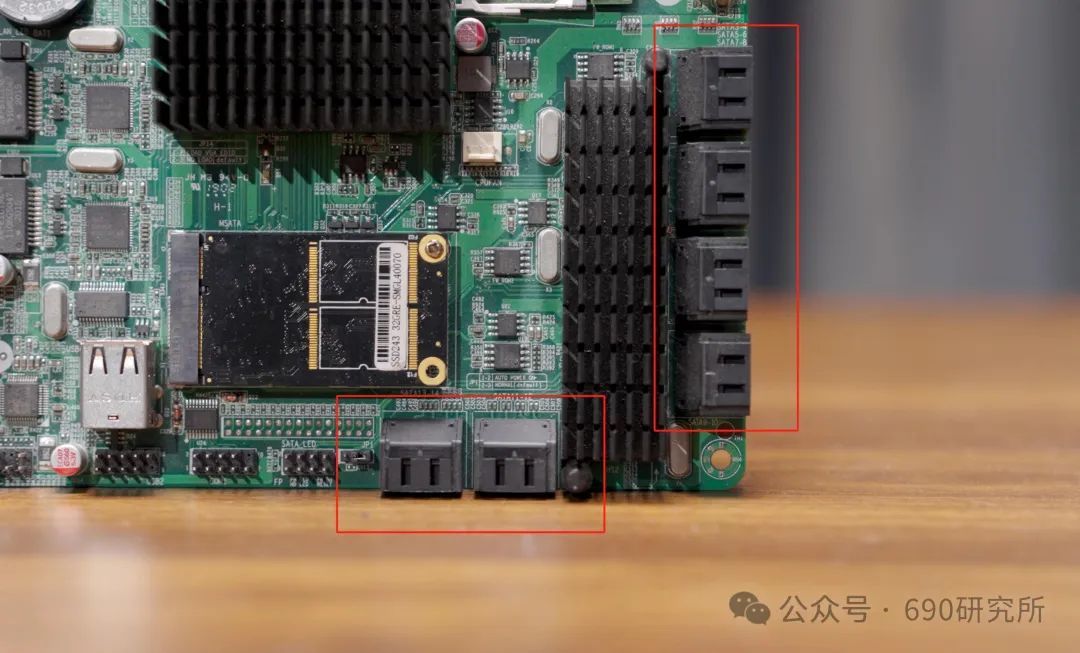右下角这里就是最核心的SATA接口了,侧边跟底部加起来足足有12个!我只能说这个J1900的U和这俩双千兆就是白瞎了这个配置,要是能有个N5105加双2.5G,那这个板子别提有多爽了。