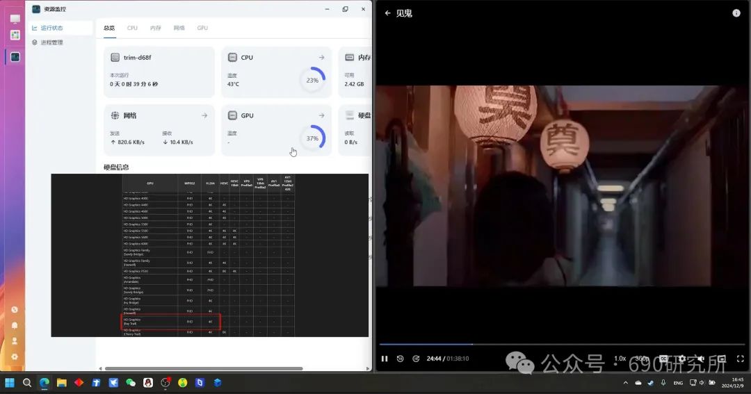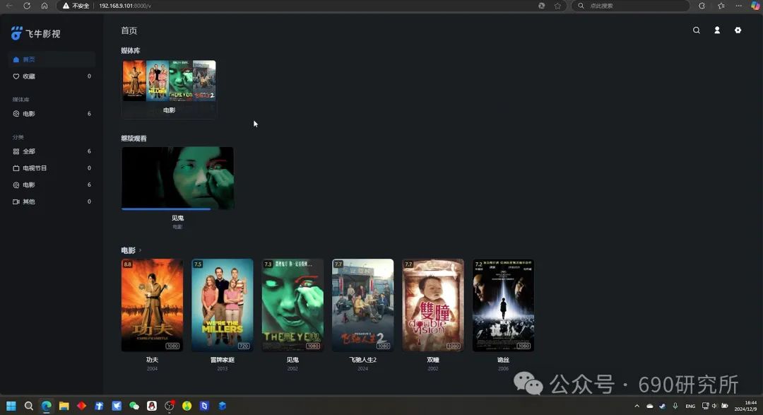 这里我们也测试了下转码,在飞牛影视里播放1080p的老电影设置低码率转码,这个GPU和CPU的占用率都很低。