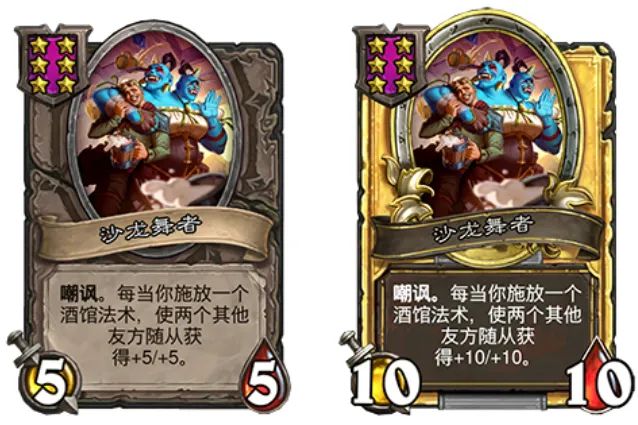 改动后:5/5。嘲讽。每当你施放一个酒馆法术,使两个其他友方随从获得+5/+5。