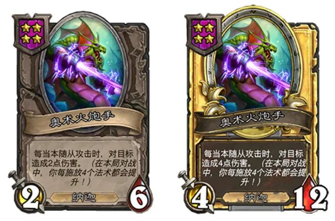 改动后:2/6。每当本随从攻击时,对目标造成2点伤害。(在本局对战中,你每施放4个法术都会提升!)