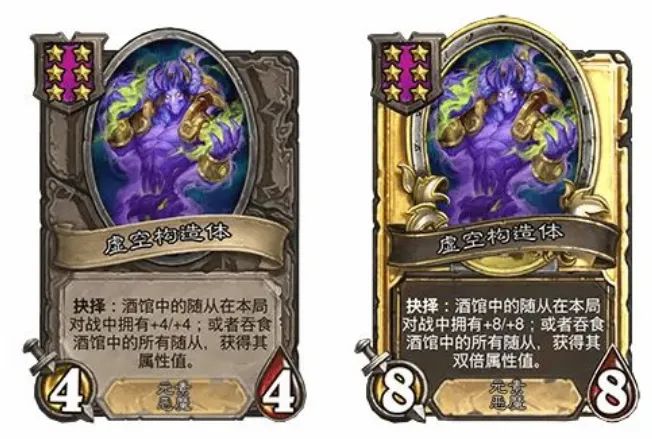 改动后:4/4。抉择:酒馆中的随从在本局对战中拥有+4/+4;或者吞食酒馆中的所有随从,获得其属性值。