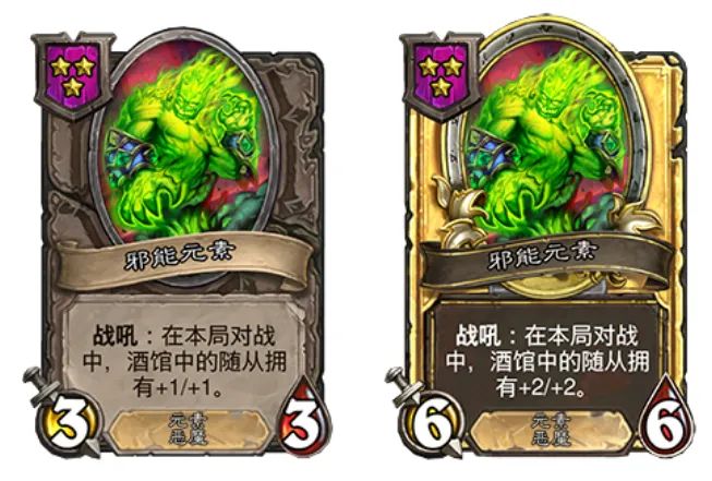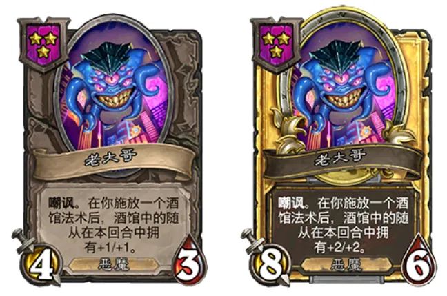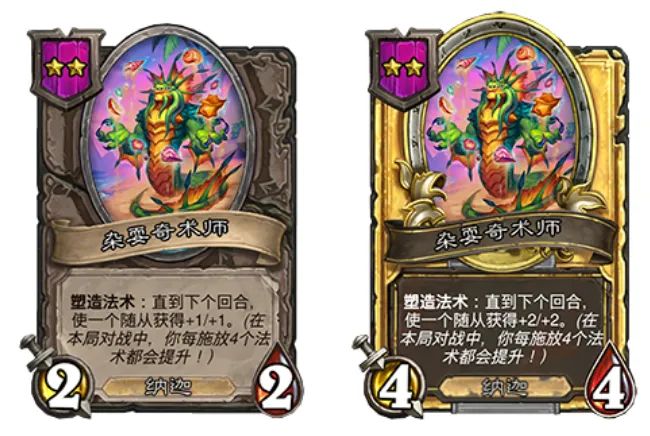 改动前:4/5。嘲讽。每当你施放一个酒馆法术,使两个其他友方随从获得+4/+4。