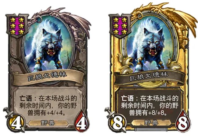 改动后:4/4。亡语:在本场战斗的剩余时间内,你的野兽拥有+4/+4。