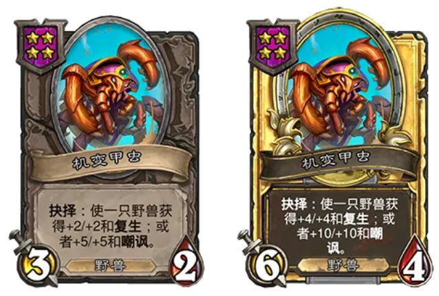 改动后:[等级4]3/2。抉择:使一只野兽获得+2/+2 和复生;或者+5/+5和嘲讽。