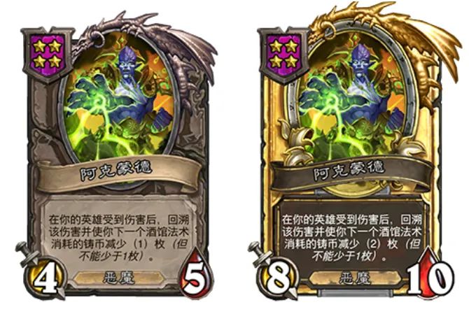 改动后:[等级4]4/5。在你的英雄受到伤害后,回溯该伤害并使你下一个酒馆法术消耗的铸币减少(1)点(但不会小于1枚)。