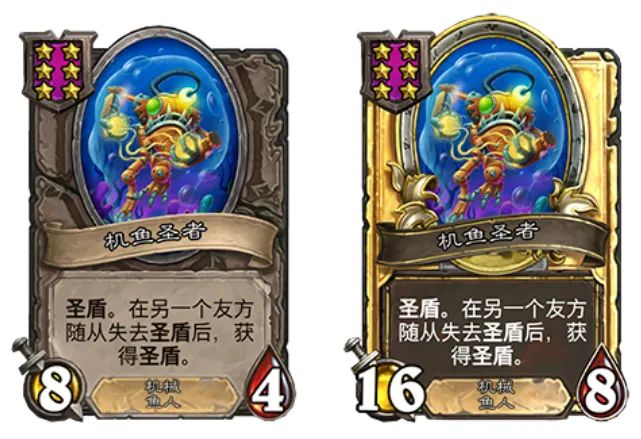 改动前:[等级5]6/4。在另一个友方随从失去圣盾后,获得圣盾。