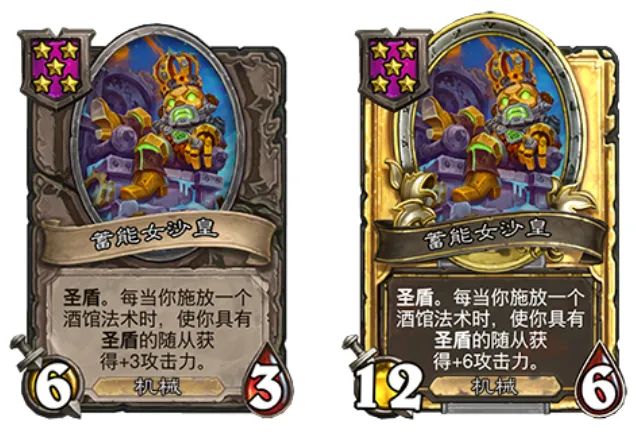 改动后:6/3。圣盾。每当你施放一个酒馆法术时,使你具有圣盾的随从获得+3攻击力。