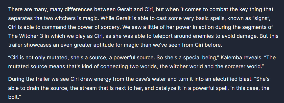 關於希裏的法術,巫師4遊戲總監表示:“希裏的突變,意味着她連接了兩個世界,獵魔人世界和巫師世界。”我個人的理解是,希裏既是獵魔人也是一名女巫,玩家可能會有更多的“職業”或“流派”可以選擇,比如強大的近戰法爺或者遠程魔導師,或者是皮糙肉厚的戰士,亦或是靈巧的刺客。這可能直接改變遊戲的玩法,讓獵魔人希裏徹底擺脫傑洛特那些蹩腳的低端法術。