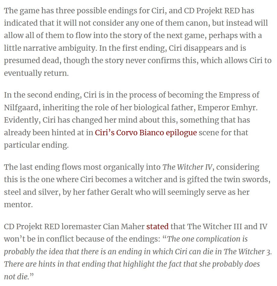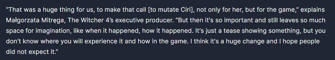 CDPR確認巫師4希裏的英語配音由之前的喬·懷亞特(Jo Wyatt)換爲Ciara Berkeley,一個可愛的小姐姐。