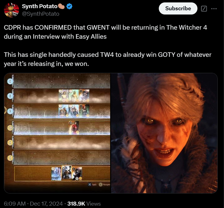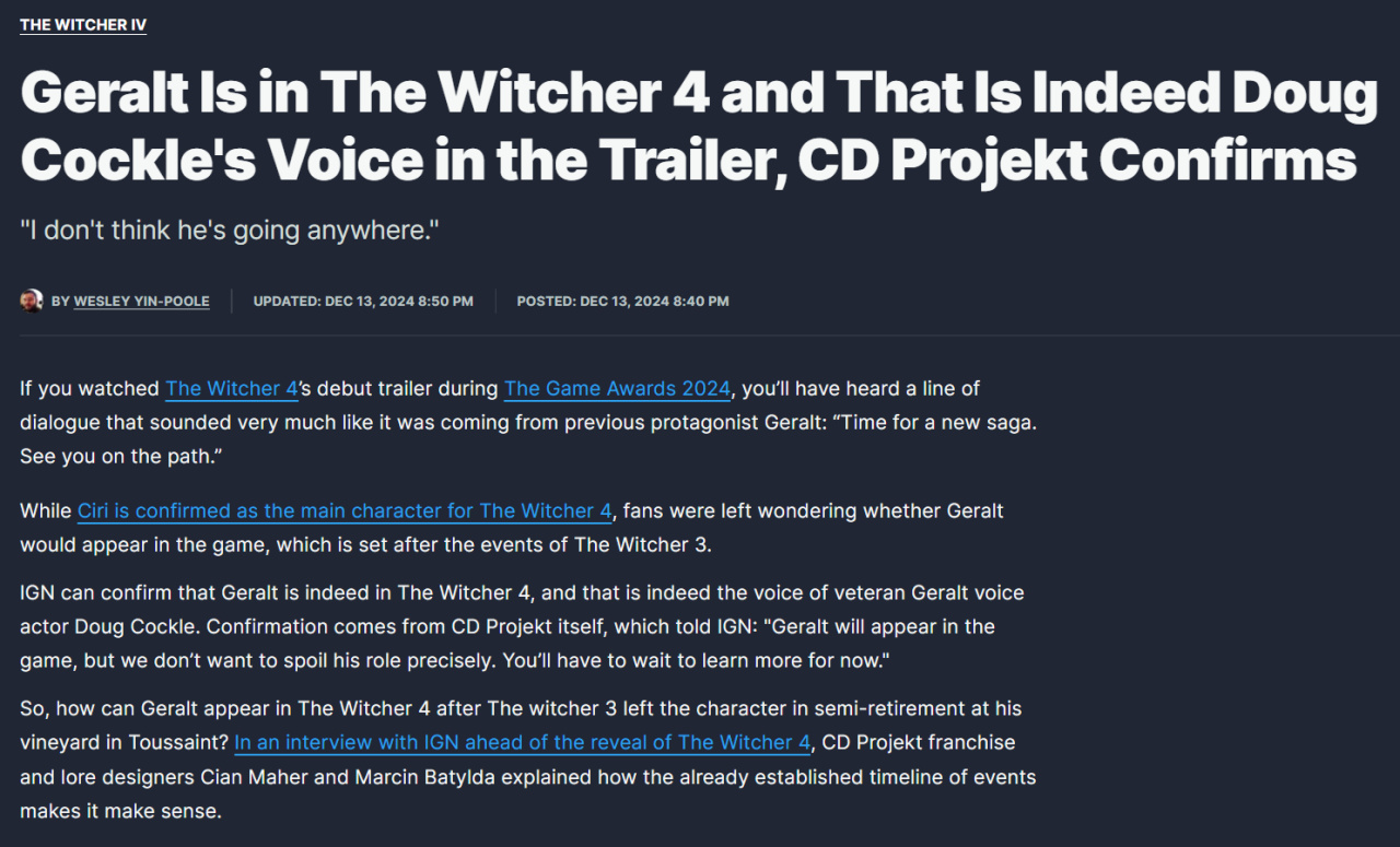 CDPR也確認傑洛特會出現在巫師4遊戲中,但並沒有透露傑洛特會在希裏的新冒險裏扮演什麼角色。TGA現場的預告片結尾,會出現傑洛特的聲音,這個聲音在其他預告視頻中基本都被剪掉了。