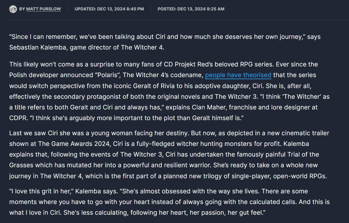 遊戲總監Sebastian Kalemba則表示,巫師4發生在狂獵之後的幾年,所以希裏顏值變化是因爲年齡增長而“衰老“,這套理論似乎並不能站得住腳。