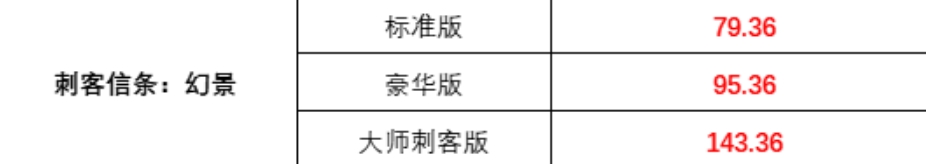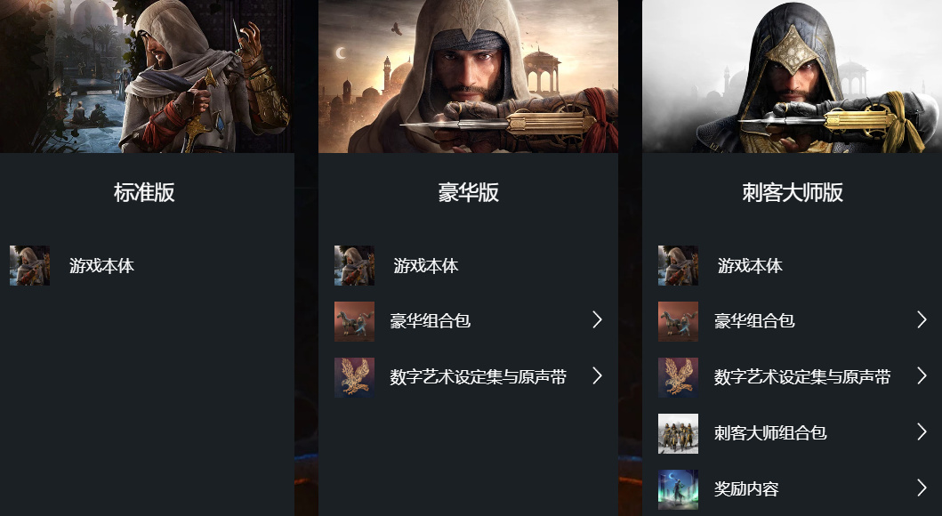 最貴的大師刺客版是《刺客信條:幻景》的終極版本,包含遊戲本體、所有裝扮武器類內購道具、以及六款附加組合包: