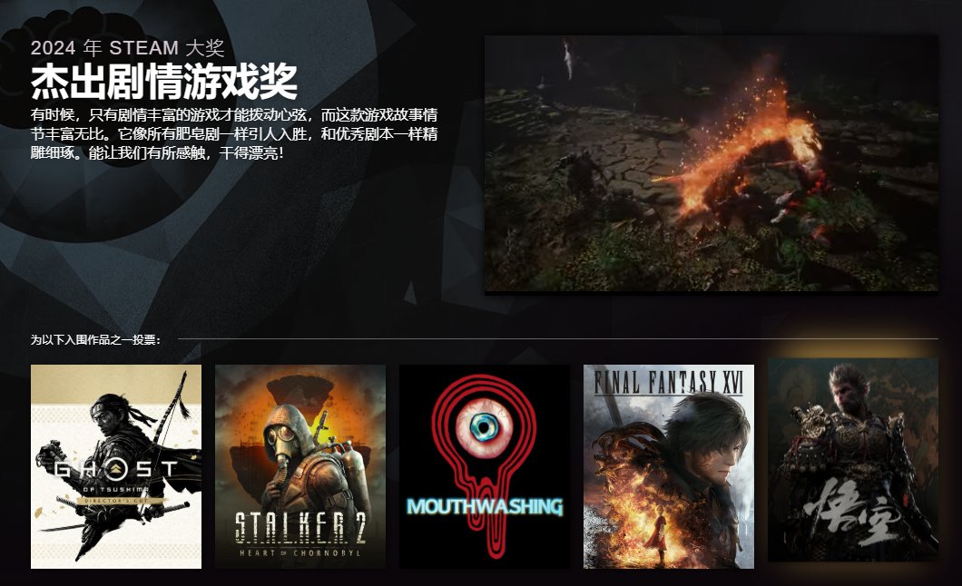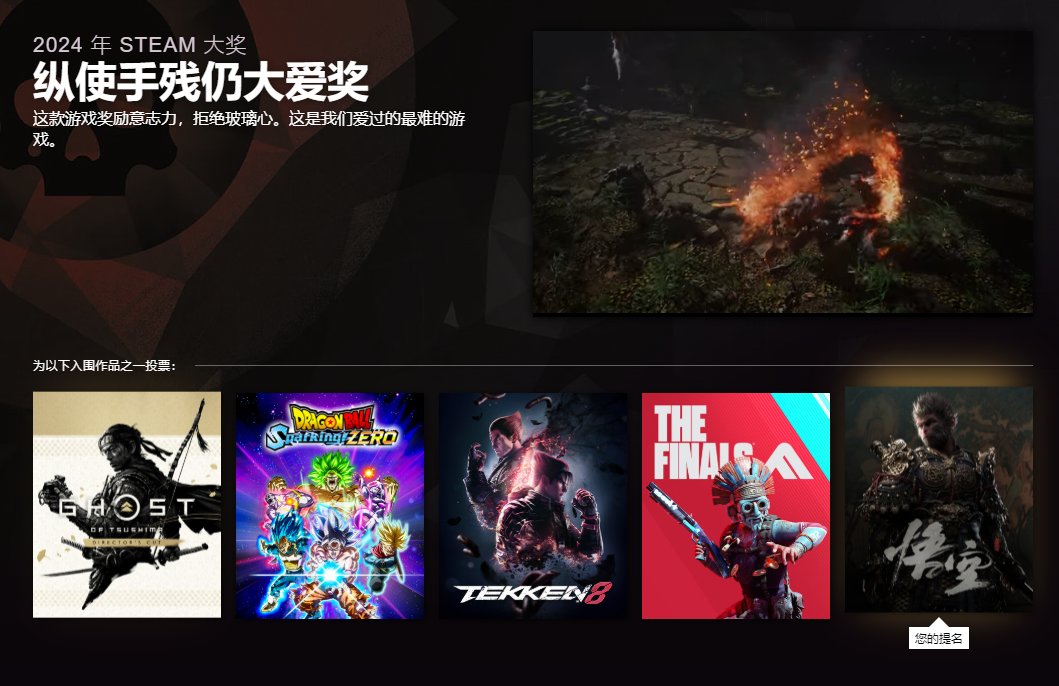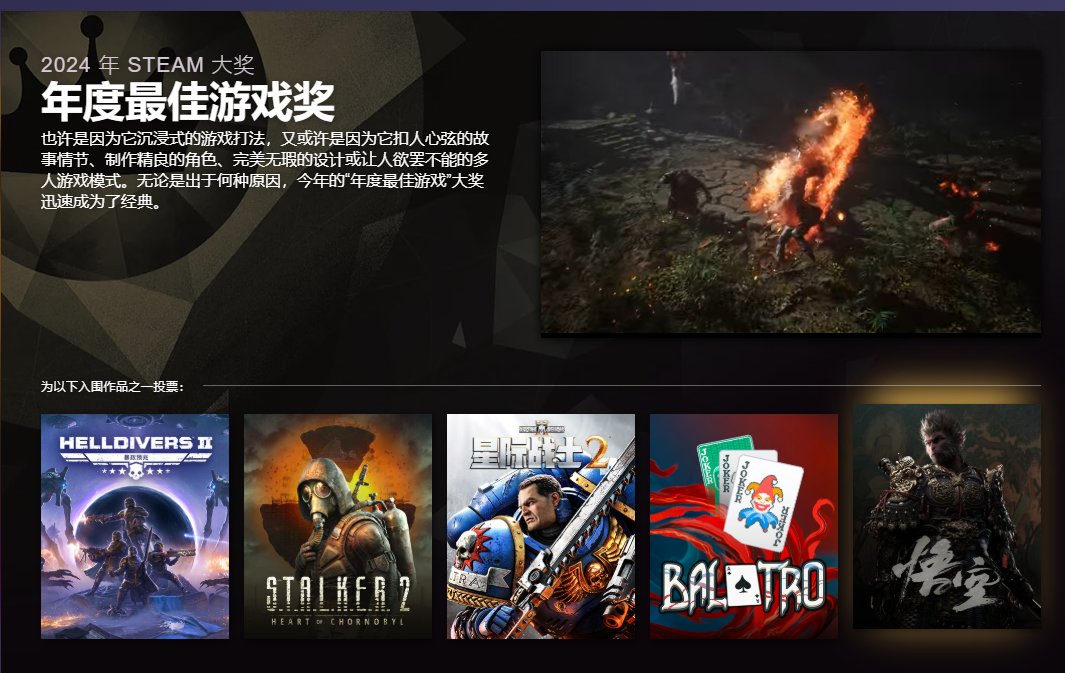Steam已经公布了2024年Steam大奖的入围游戏名单,其中《黑神话:悟空》获得了年度最佳游戏奖、纵使手残仍大爱奖、杰出剧情游戏奖的提名!