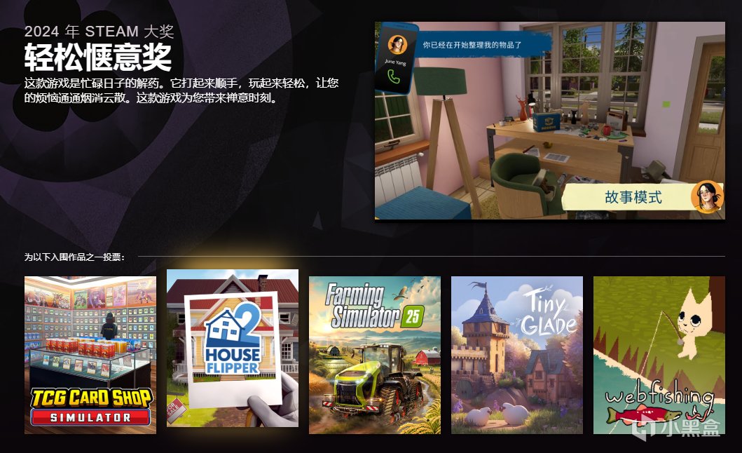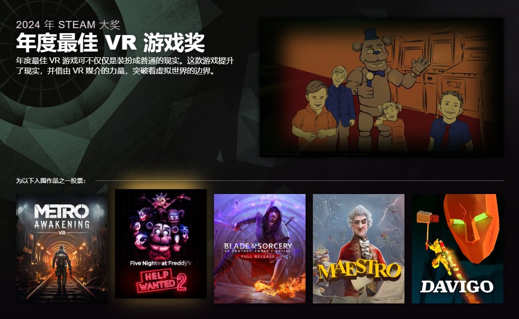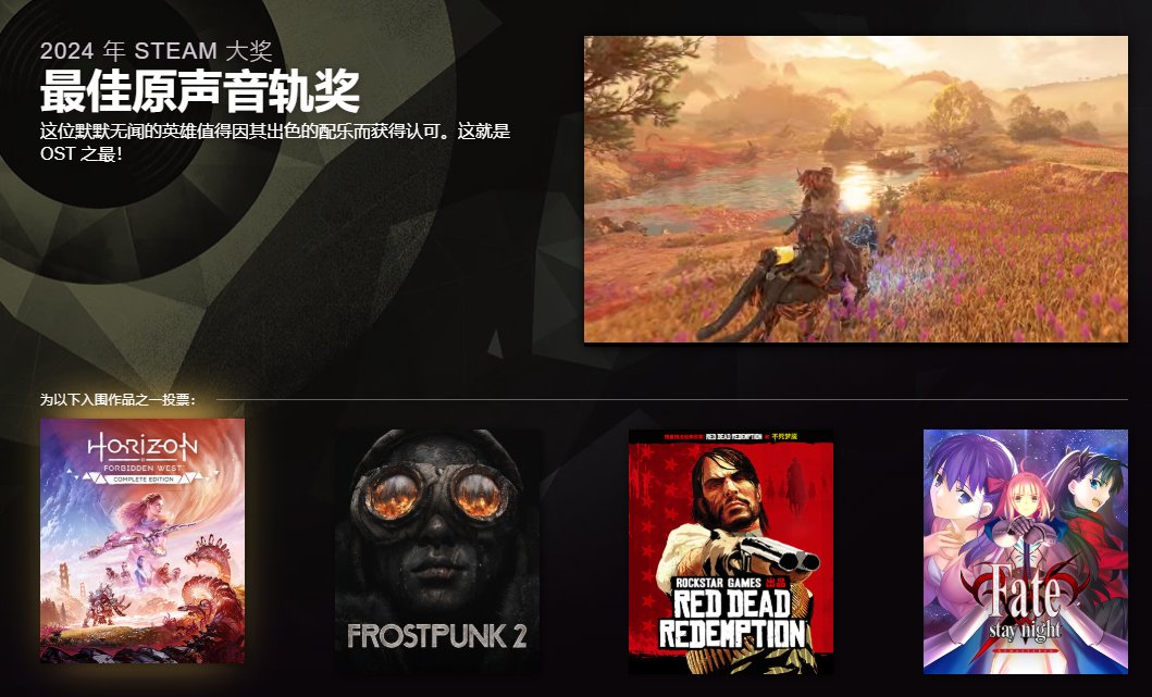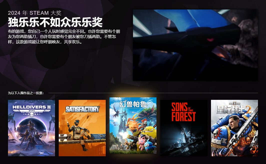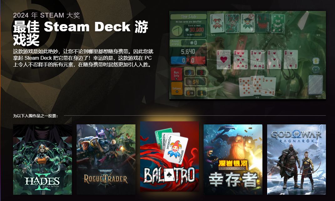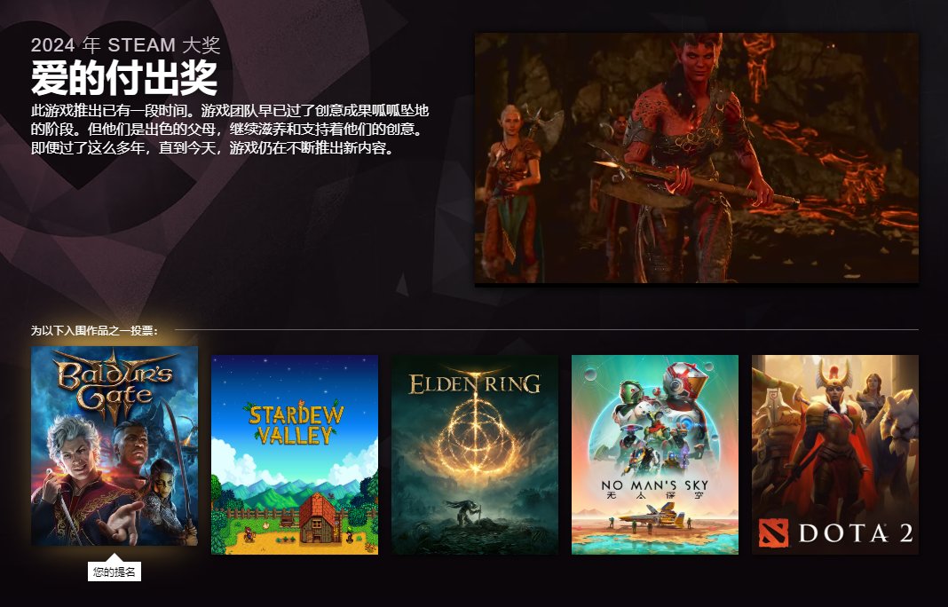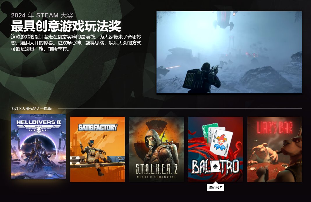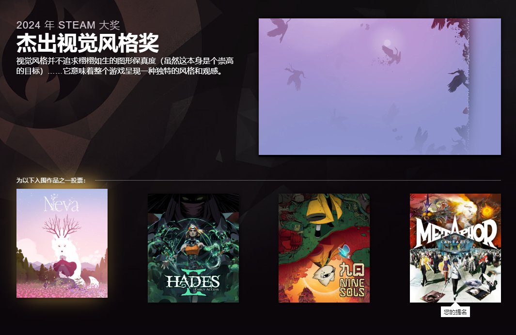 投票将于北京时间12月20日凌晨2点开始,1月1日凌晨2点截止,并将揭晓获奖名单。Steam大奖是100%由玩家票选的奖项。