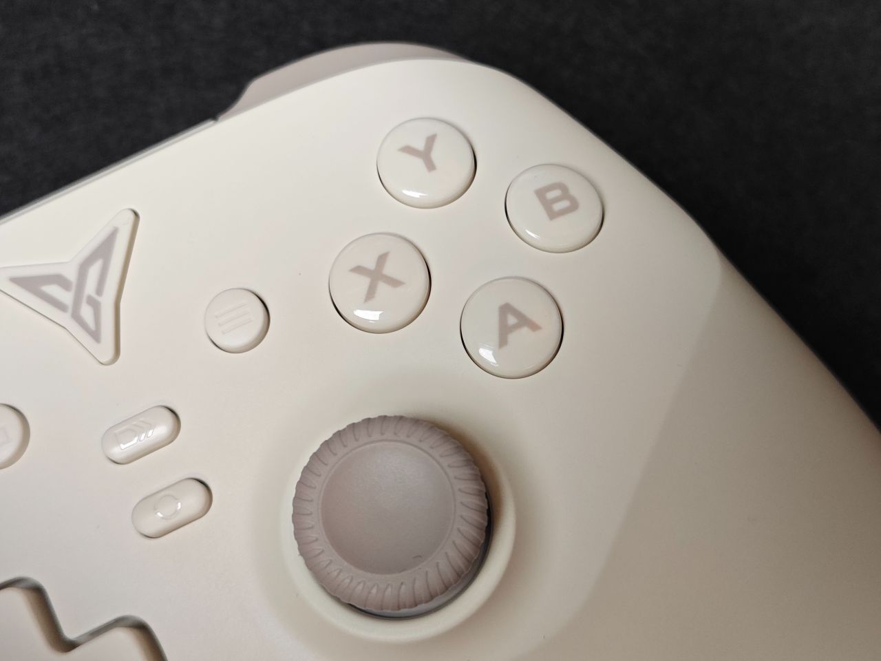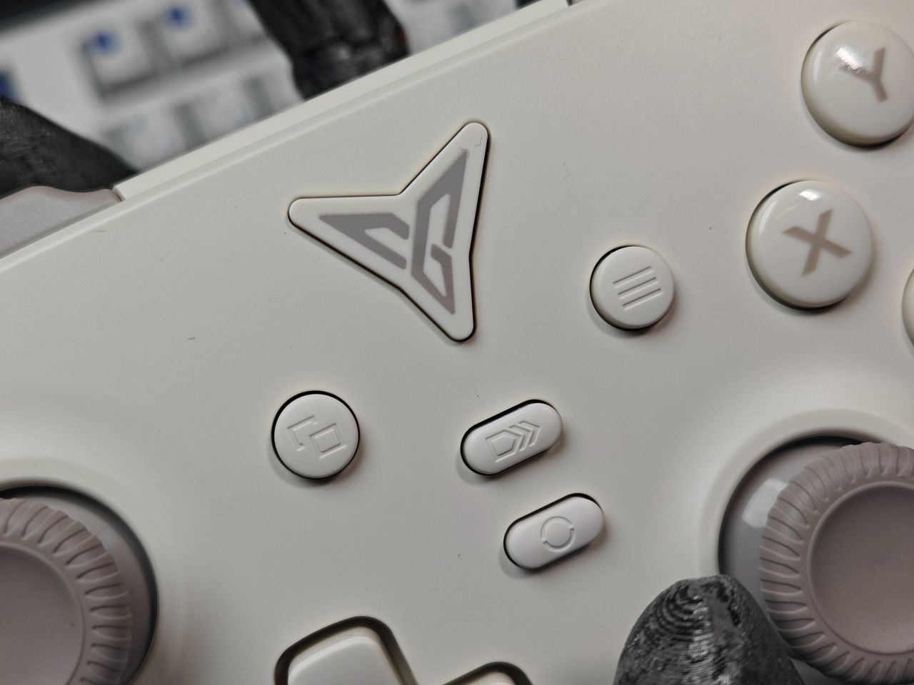 拿到手可以發現,沙漠狐有其獨特的一道設計語言,而非採用冰原狼及黑武士的傳統外觀。沙漠狐給人的第一感覺就是非常舒服。整個手柄都是米白色及淺灰色的配色,非常乾淨簡約。面殼非常親膚,摸上去手感非常細膩溫潤,而非傳統百元價位手柄做的細磨砂處理。手柄的按鍵區域位置做了一個單獨的切面,所以能看到按鍵面板與握持區域中有一條貫穿的線條。因此,手柄雖然配色比較素,但是依舊富有設計感。可以說在百元價位內,沙漠狐但面殼處理方面是頂級的。