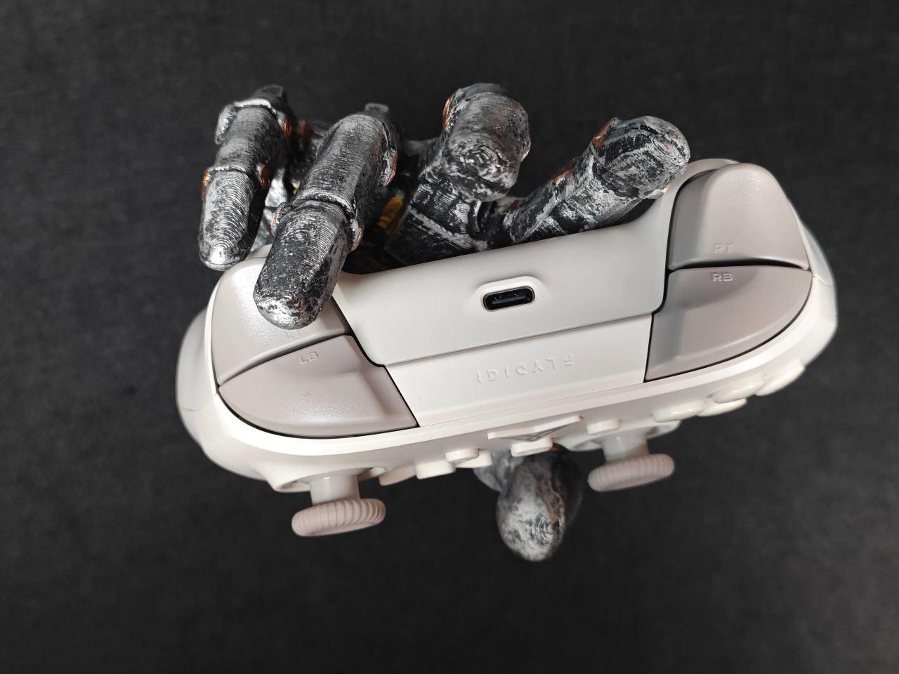 來到肩部,首先,非常驚喜的是,飛智取消手機支架槽了!居中位置只保留了充電口,所以看着非常簡潔。肩鍵是沙漠狐唯一一個用上了機械開關按鍵。他的按鍵手感一致性很不錯,按壓非常脆爽,響應很及時。不過按鍵彈簧音有點嚴重,這點希望飛智後續能夠調整一下。手柄扳機爲霍爾線性扳機,扳機阻尼適中,按壓順滑精準,按壓並沒有聽到雜音,體驗非常舒服。不過可惜的是,肩鍵及扳機並未做防滑紋理處理。
