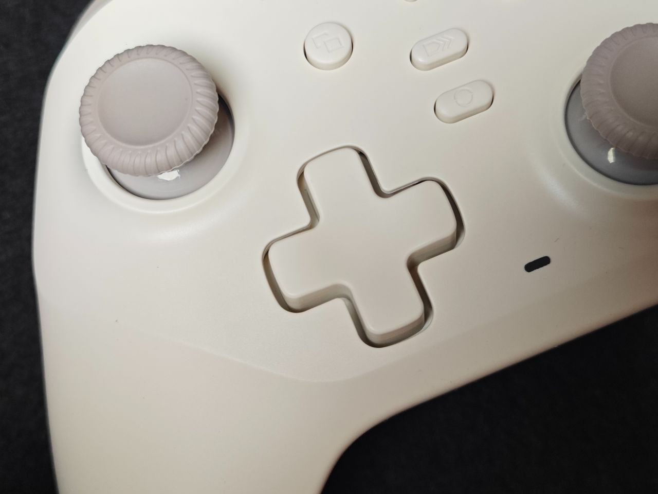 手柄十字鍵用的是導電膠開關,十字鍵爲經典的四向十字,十字鍵的邊緣與面殼間的縫隙較大,不過好在按鍵做得比較緊,輕輕推動十字鍵並沒有出現搖晃的現象。十字鍵做了中心點支撐,能夠很好的防止串鍵的情況。十字鍵的按鍵偏硬,搓久了手比較累。
