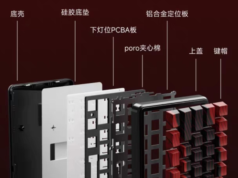 有意思的是鍵盤採用top的結構,這在低價位磁軸中還是比較少見的,鋁合金定位板+p棉,打擊起來倒是不硬,甚至可以拿軟來形容它
