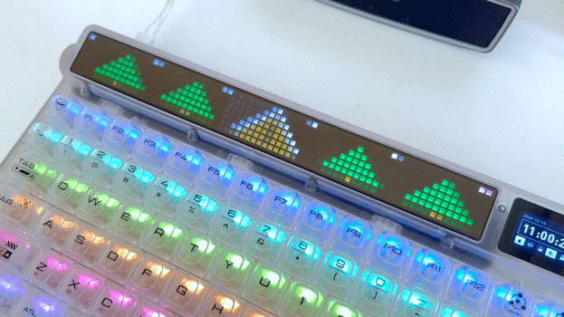 最显眼的,莫过于键盘的顶部了。这是它最为独特的LED智能点阵屏+TFT多媒体屏双屏设计,而且两个屏幕都支持自定义内容显示。
