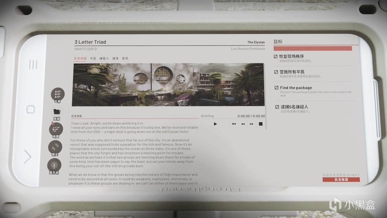 《严阵以待》作为一款战术拟真射击游戏,和其他游戏有一些截然不同的地方。其他游戏主打的是一个快,然后就是速战速决。而严阵以待主打的就是一个慢,一步一个脚印,三步回头,两步转身。因为除了需要消灭的恐怖分子以外,还有无辜的平民或者是人质需要得到你的保护。我们是反恐小队的特警,胜利对于我们来说只是其次。每次进行任务都会以小队为基础进行,去执行各种任务。按下tap拿出手机就可以查看你的任务目标,除了介绍详细的背景故事以外就是任务目标。一般都会包含两个最基础的任务“清除或者制服敌人”和“拯救人质”,其他方面根据地图的不同会做出一些专属的事件。当然对待一些暴躁的平民,我们也不需要那么的客气。