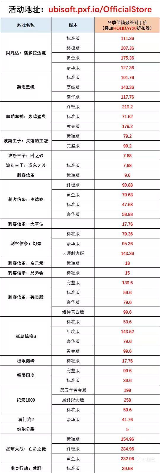目前育碧已經開啓了冬促,時間由12月17號至1月2號,多款大作迎來折扣,輸入優惠代碼(HOLIDAY20)即可有額外20%的折扣。