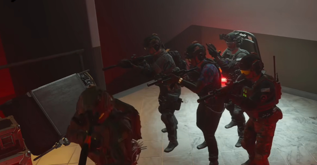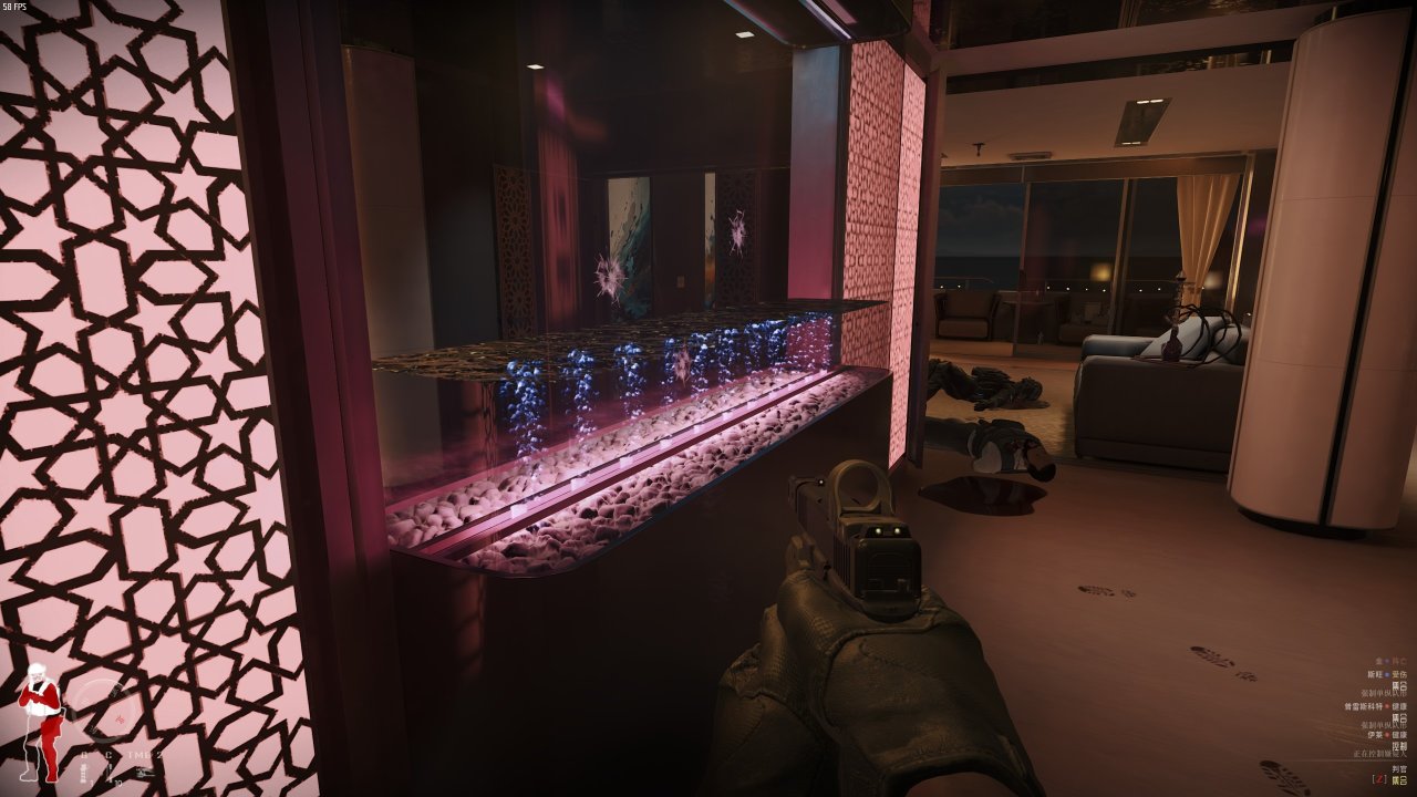 宁静而又祥和的环境会让你忘记来此的目的,直到你一脚踹开门,悍匪光速击倒你。当你在室内激战时,玻璃会被子弹击碎,管道会漏气,缸里的水会逐渐流尽。闪光弹能让贪吃的你吃到饱,被受伤后的晕厥会让你完全丧失战斗力。还有一些更加仿真的地方,像戴上夜视仪后的不同视觉效果,红点瞄准和弹道偏差,更加真实的同时也使得剿匪更痛苦了。